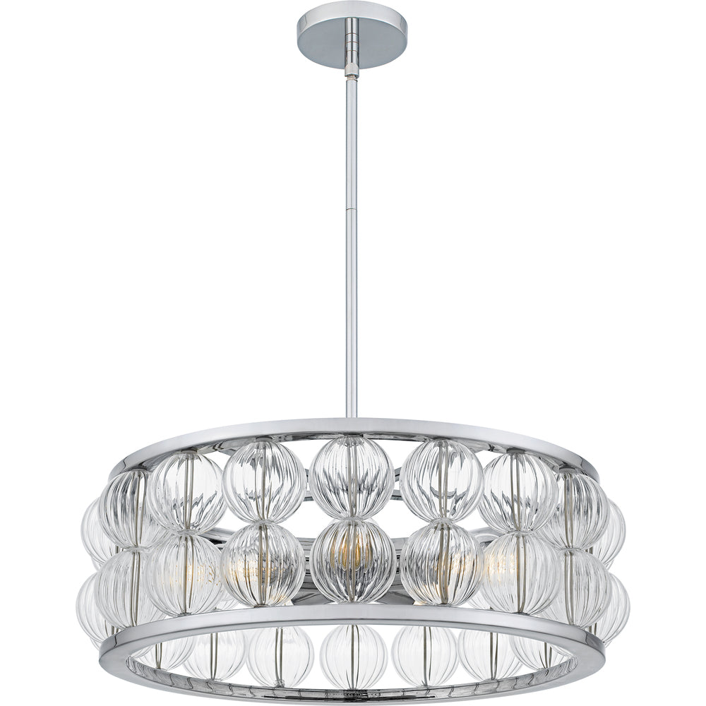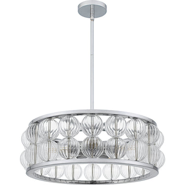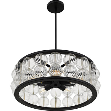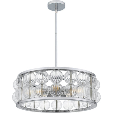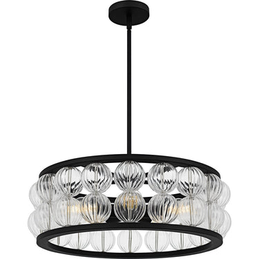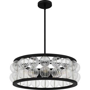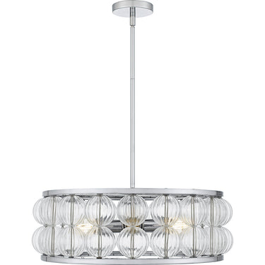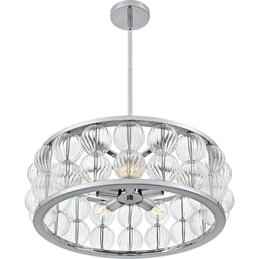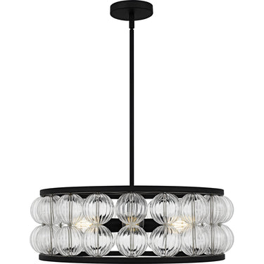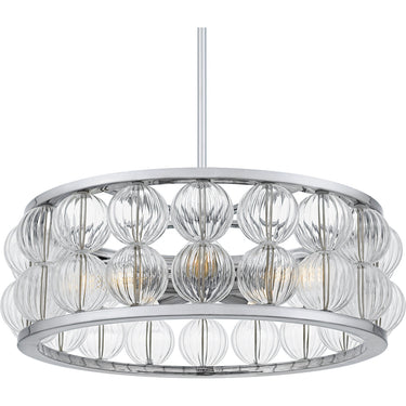 Elevate your home with the Terrarock collection, offering both pendant and ceiling fan light options that blend glam and modern style seamlessly. This collection is designed to add a touch of sophistication and luxury to any room. Terrarock is available in two stunning finishes: matte black for a sleek, contemporary look or polished chrome for a more glamorous, reflective aesthetic. The drum shade is composed of clear ribbed glass balls, creating a unique texture and an eye-catching lighting effect that enhances the ambiance of any space.