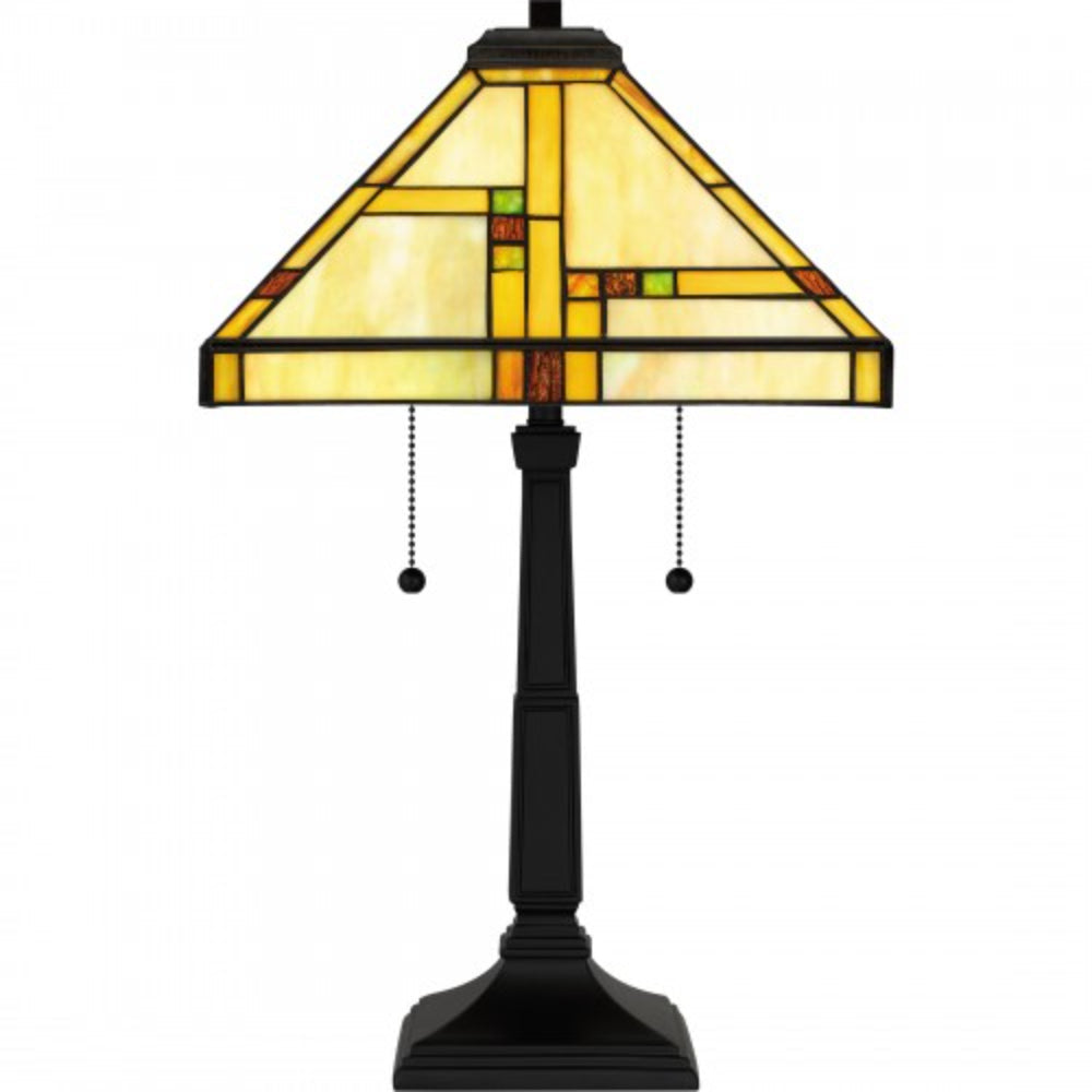 With its matte black finish and classic Arts and Crafts inspired design, the Orson table lamp delivers on both style and function. The geometric shade is made of handcrafted Tiffany glass in shades of cream, warm honey amber, and crimson. The individual glass pieces are hand assembled and carefully arranged in a unique pattern, making Orson a versatile piece in any living room, kitchen, or home office.
