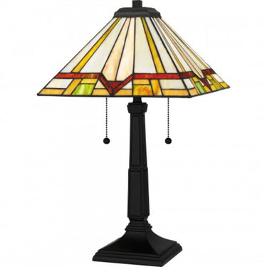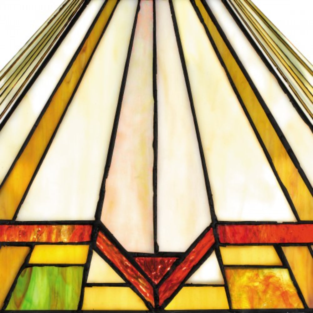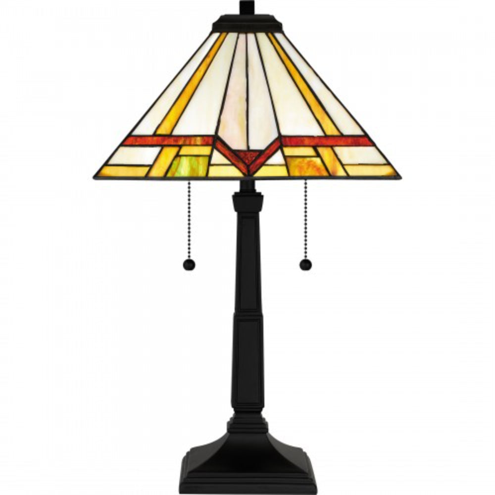 The Frederick table lamp features a matte black finish and handcrafted Tiffany glass in shades of warm honey amber, bisque, cream, and crimson. Each geometric piece of glass is hand assembled, creating a one-of-a-kind visual experience for your home. Illuminate your kitchen or living room, add style to a home office, or cozy up in your bedroom for some reading.