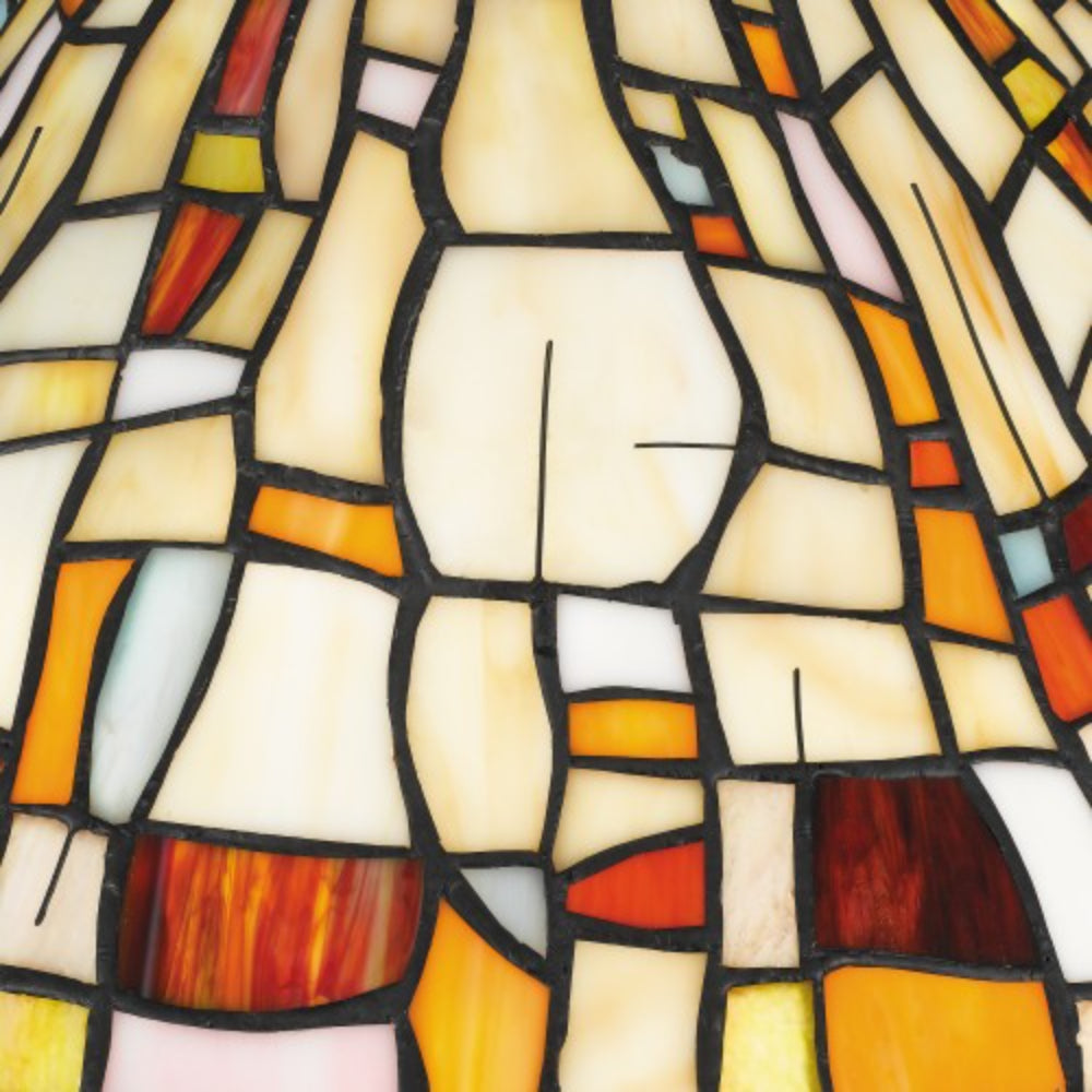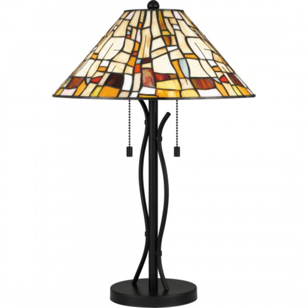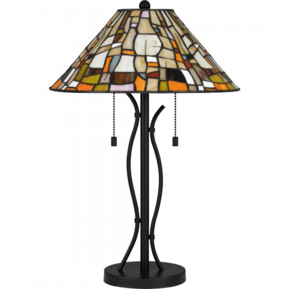 The prettiest puzzle. The Stinson table lamp, also available as a flush mount, fits together varying shapes and tones with multicolor art glass. The effect is artistic and impressive, finished with a matte black, curved base and pull chains for two bulbs.
