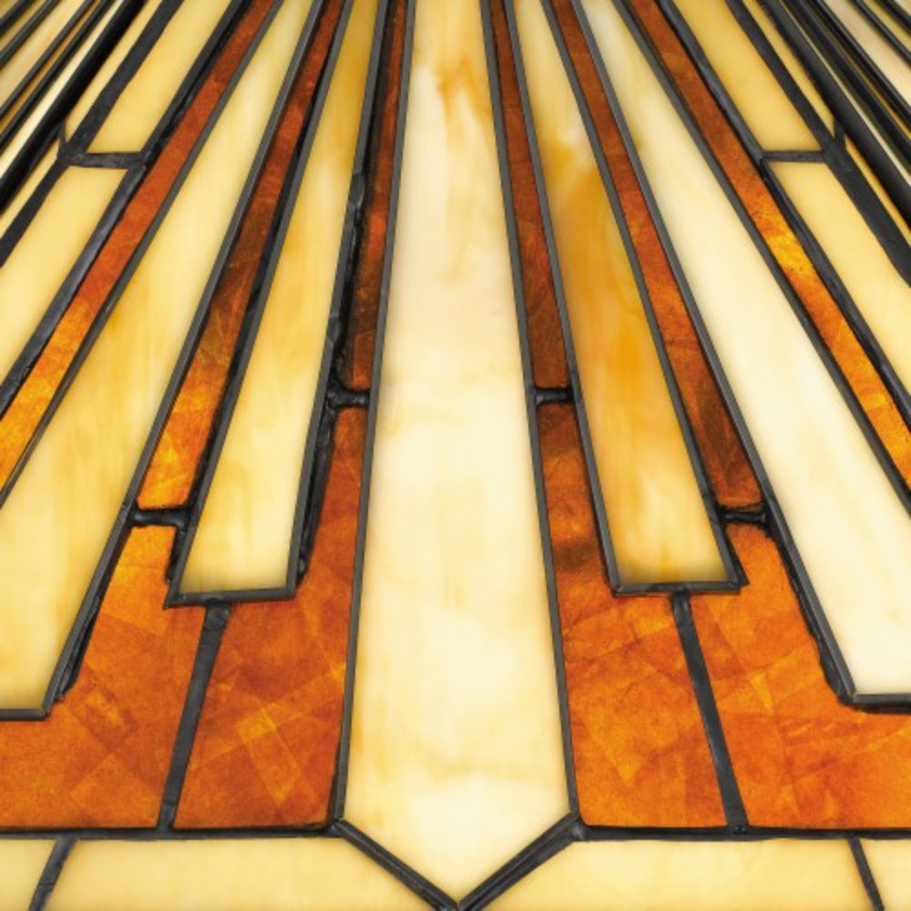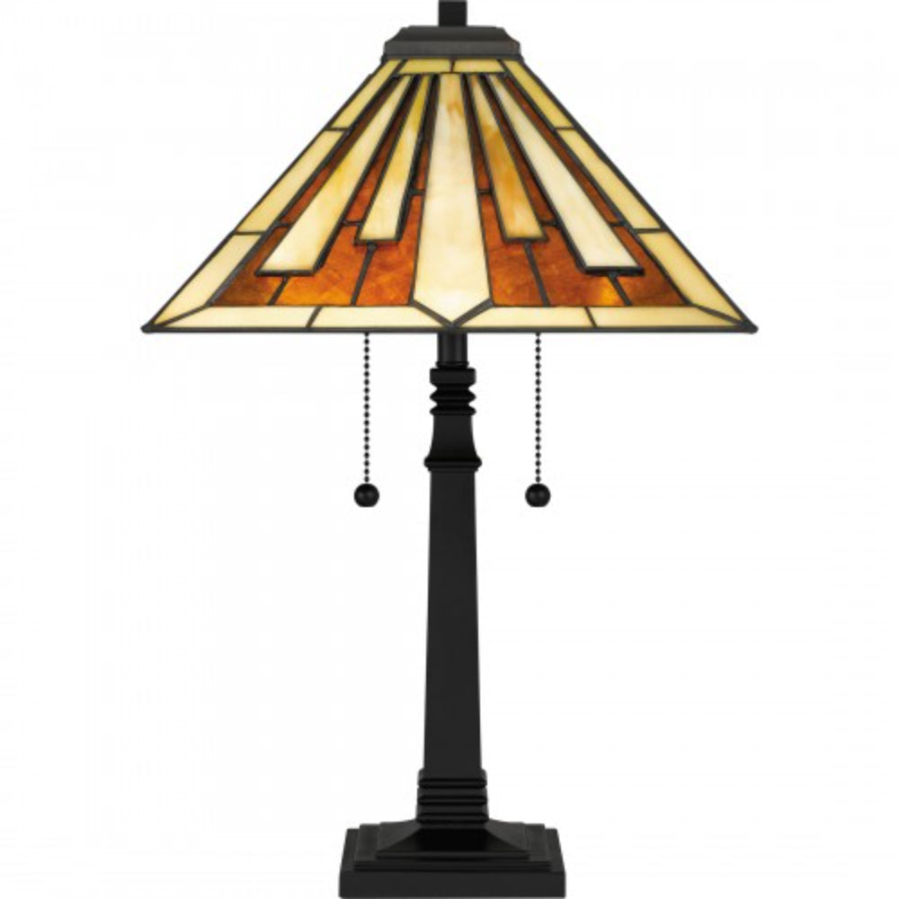 Hathaway's bold, angular motif and neutral tones makes a handsome statement in multicolored art glass. Available as a two-bulb table lamp or flush mount, this design features a matte black finish. Both styles feature special details, too: hefty pull chains for the table lamp, and a finial cap for the flush mount.