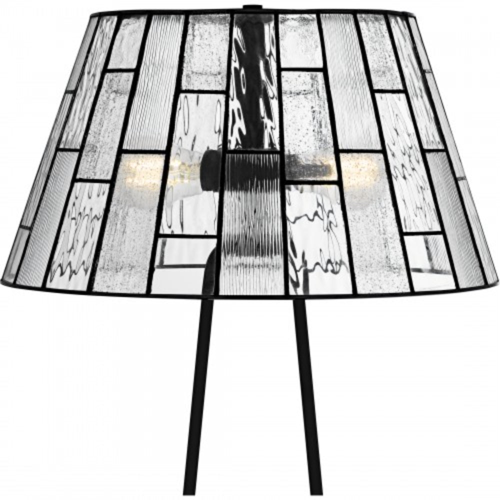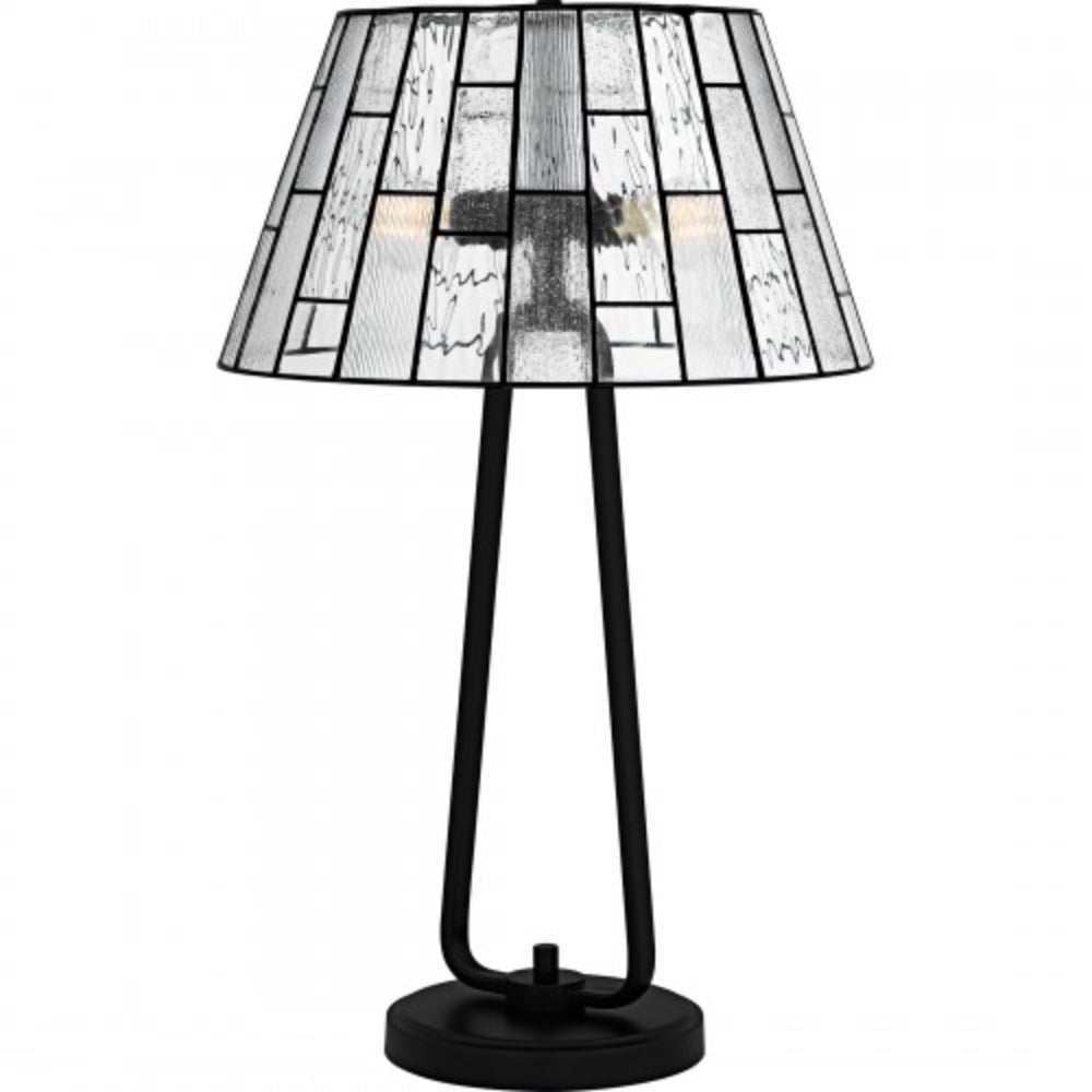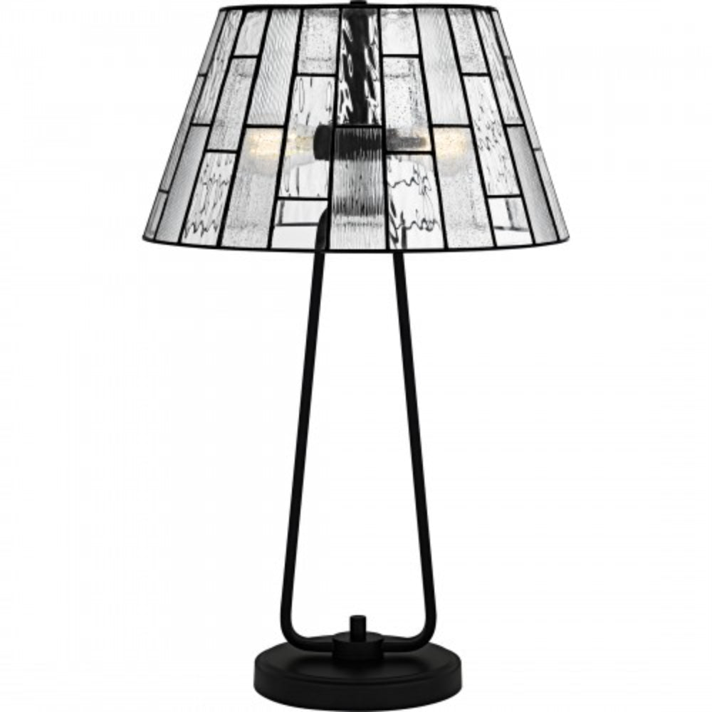 Rainier's traditional design adds simple sophistication to any space. Featuring a matte black finish that enhances its refined silhouette, this table lamp is complemented by Tiffany-inspired multitextured art glass panels, adding depth and visual interest to your decor. Enhance your living room, bedroom, kitchen, or home office with the Rainier table lamp, a perfect blend of classic style and elegance.