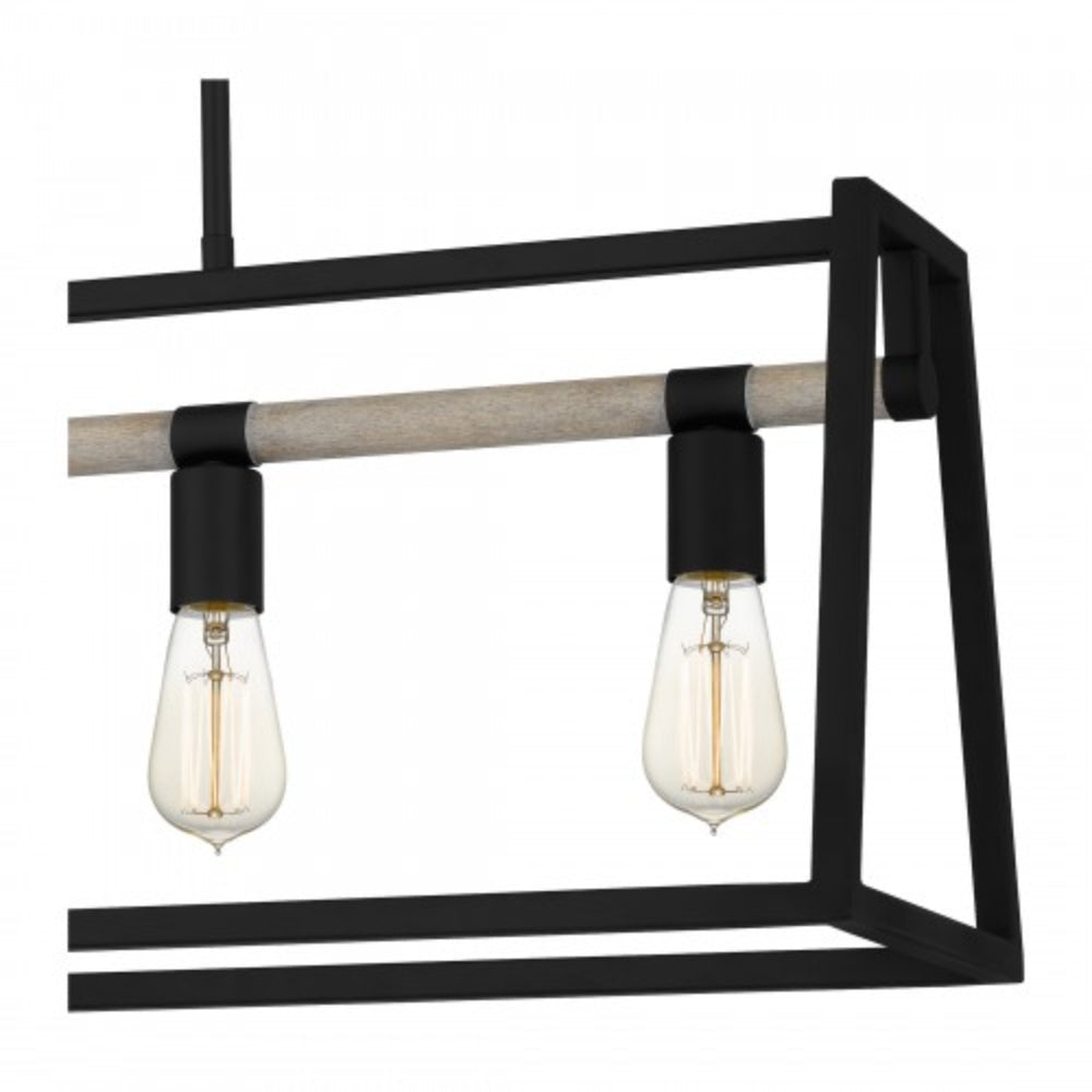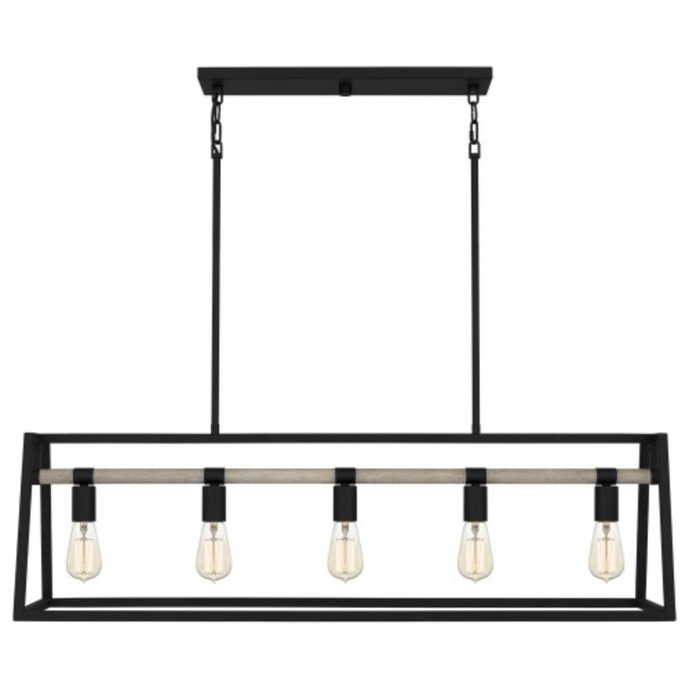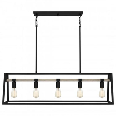 A little bit industrial, a little bit farmhouse. The Tippet light features a rustic, matte black finish paired with wood accents that cast an inviting glow. Available as a linear chandelier or semi-flush mount.