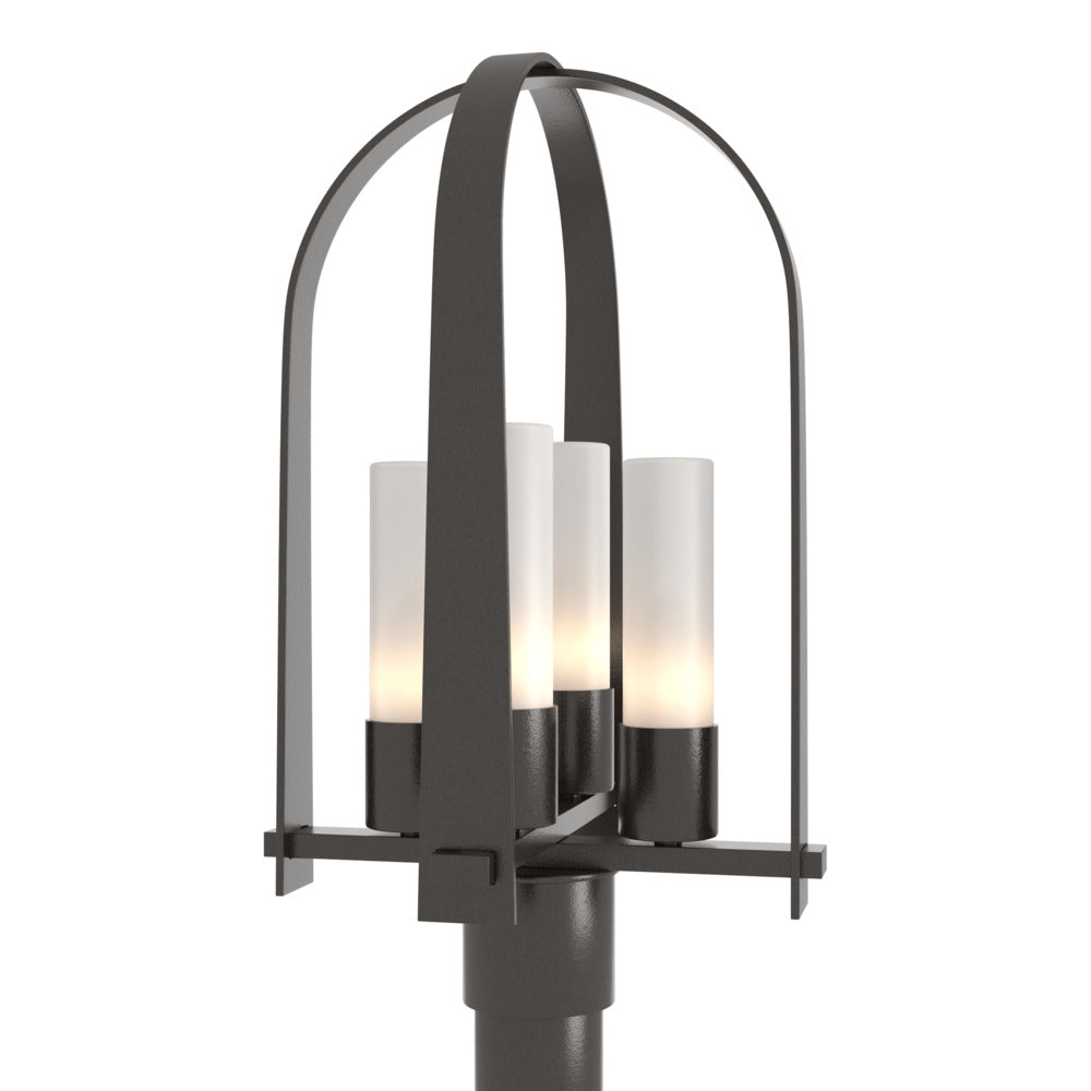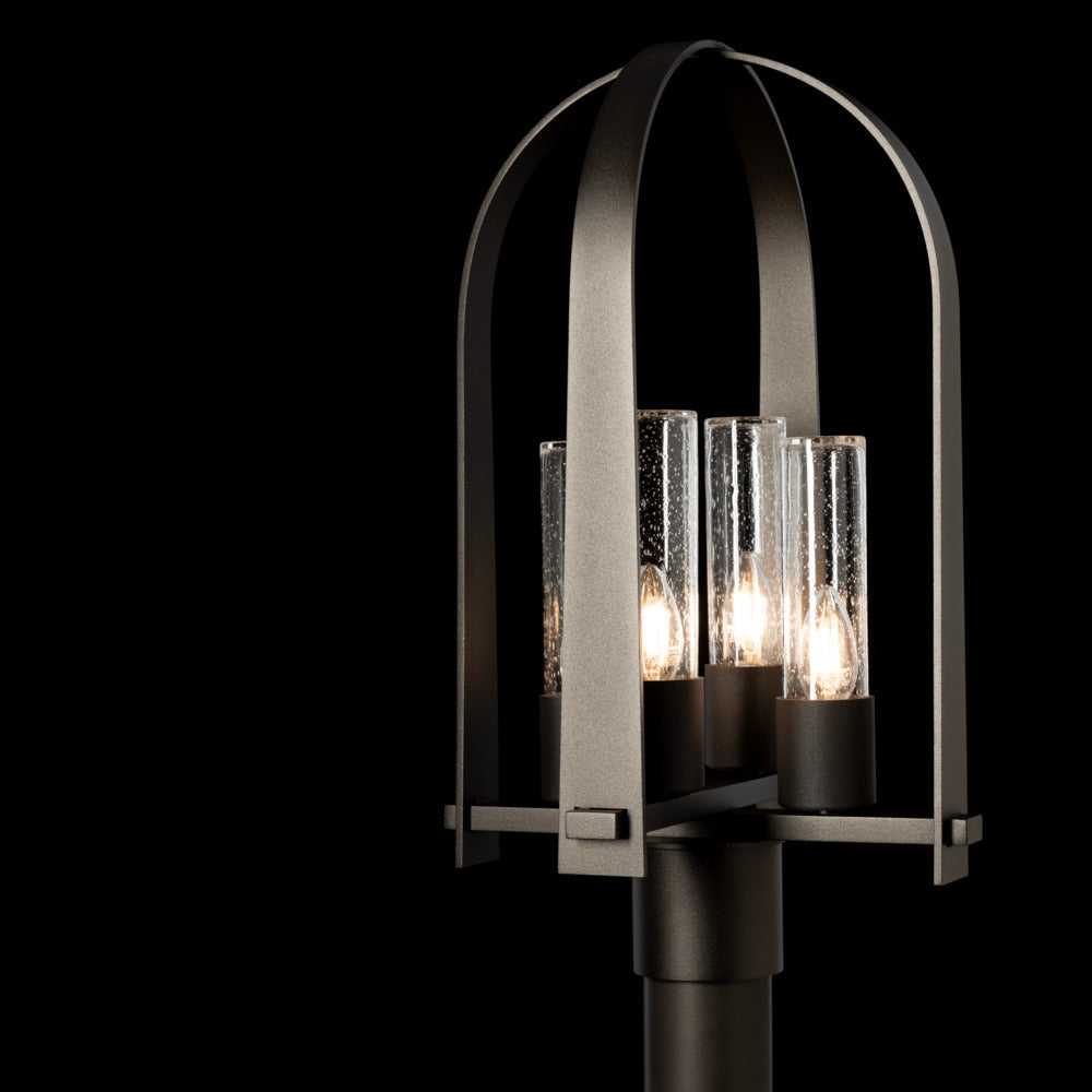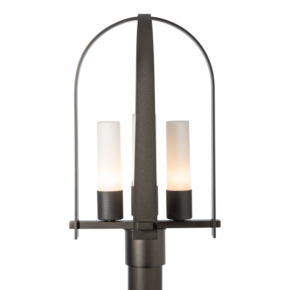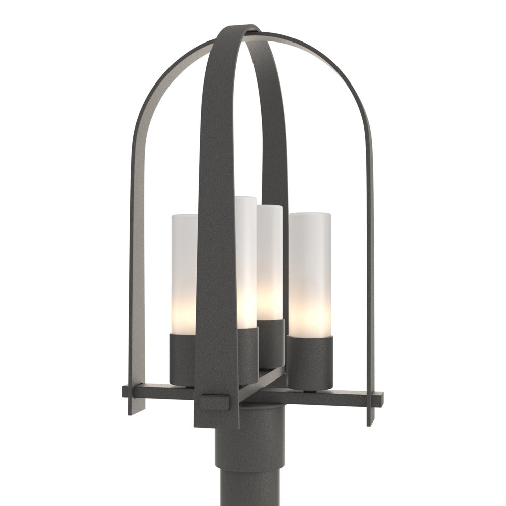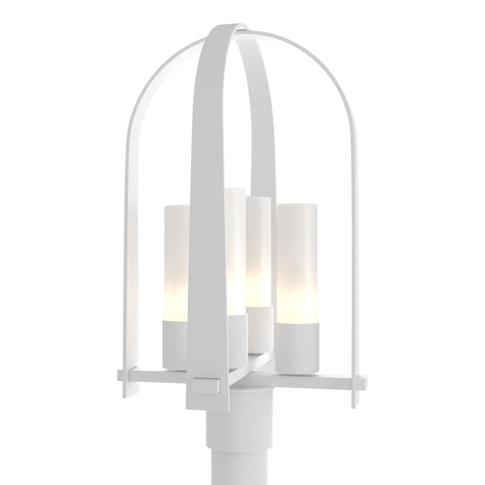 Lighting a drive or pathway, or adjacent to an entry, the Triomphe Outdoor Post Light greets guests for a safe, well-lit, yet warm and inviting welcome with its 4-light cluster nestled within the handcrafted aluminum arches. With the Triomphe, Designer David Martin created a transitional, classically arched shape with craftsman tenon details that suit a variety of architectural styles.