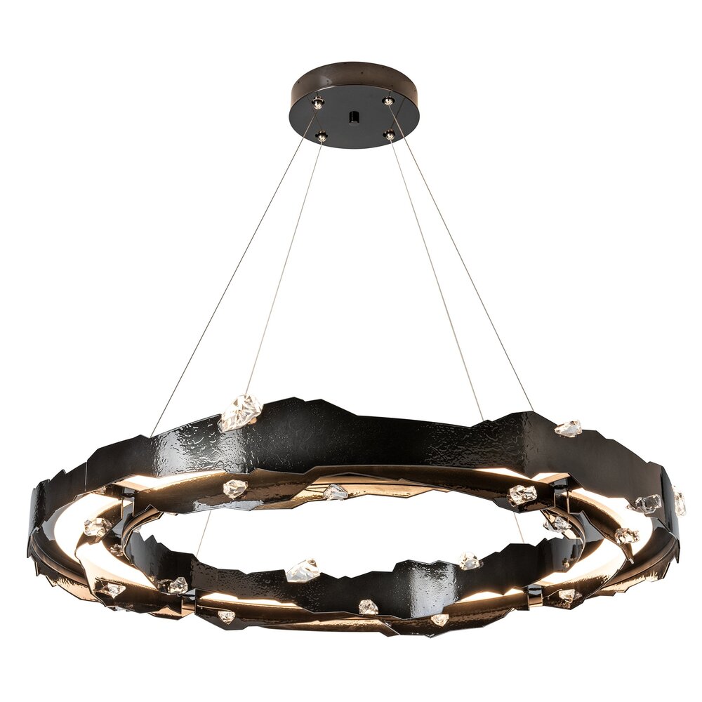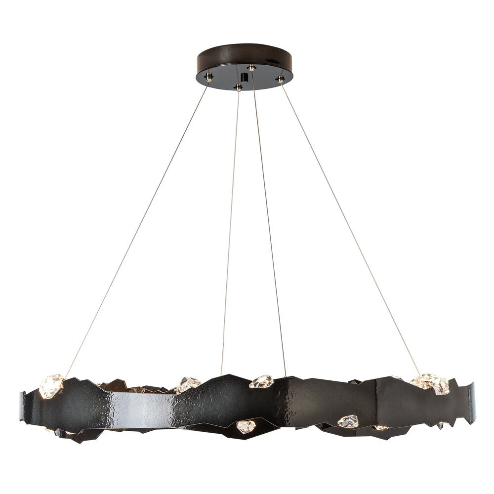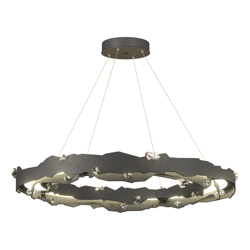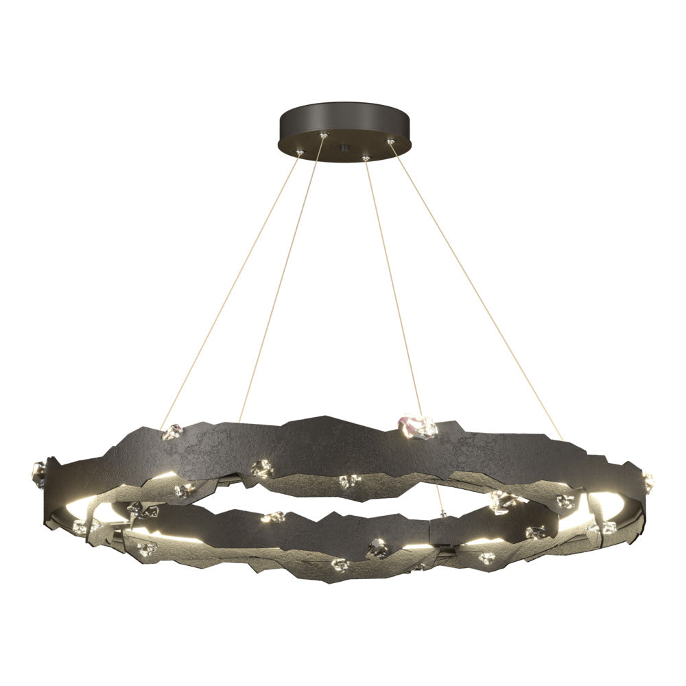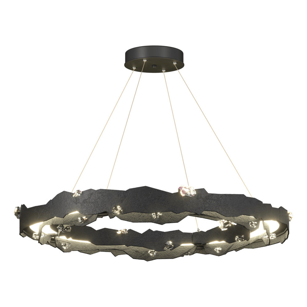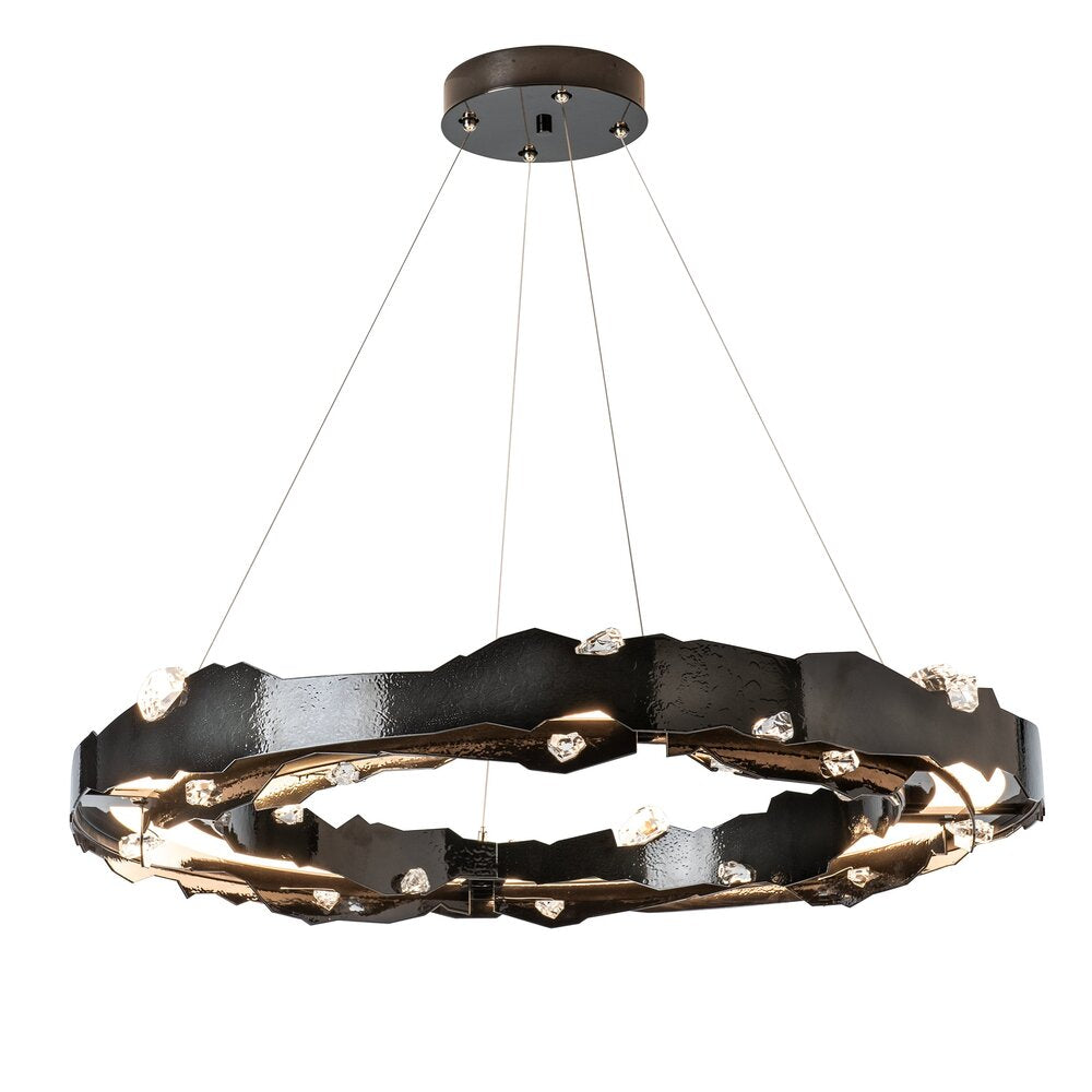 Design Team Leader Paul Marr Hilliard wanted to make a clear difference in the way crystals are used with the Trove LED Circular Pendant. "This is about geodes and the way the earth is broken open. This crystal shape is very raw and natural. Pairing that with our LED light-guide makes the crystals sparkle." With a 38.2" diameter, the Trove makes a statement with its large crystals like buried gems in the rugged, hand-forged steel "mountains".
