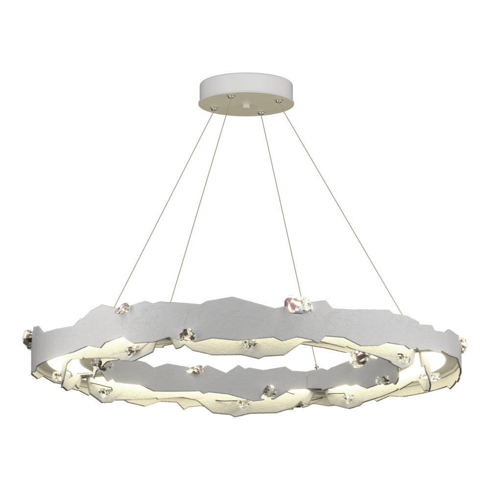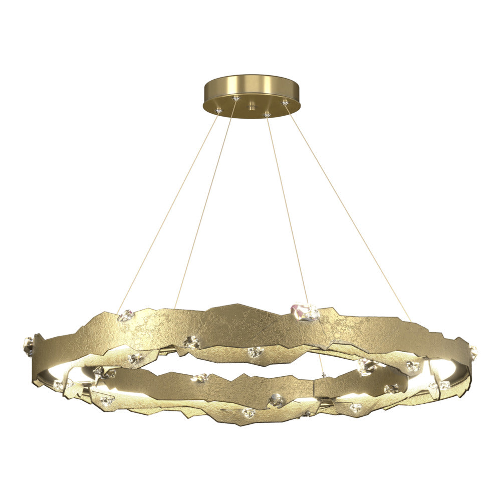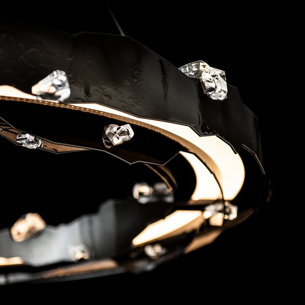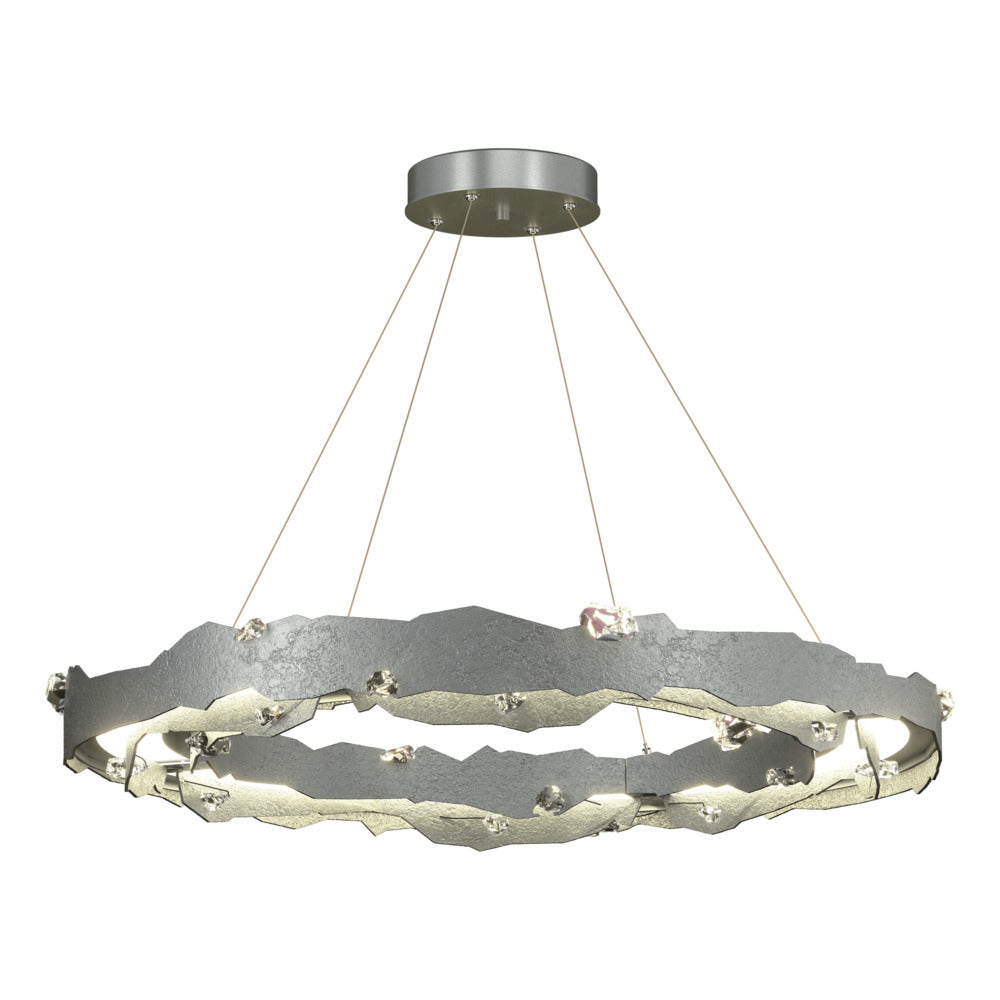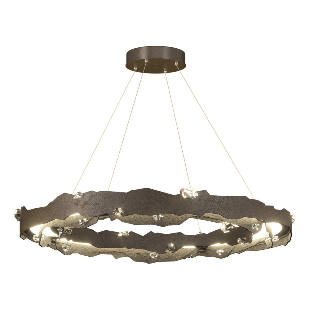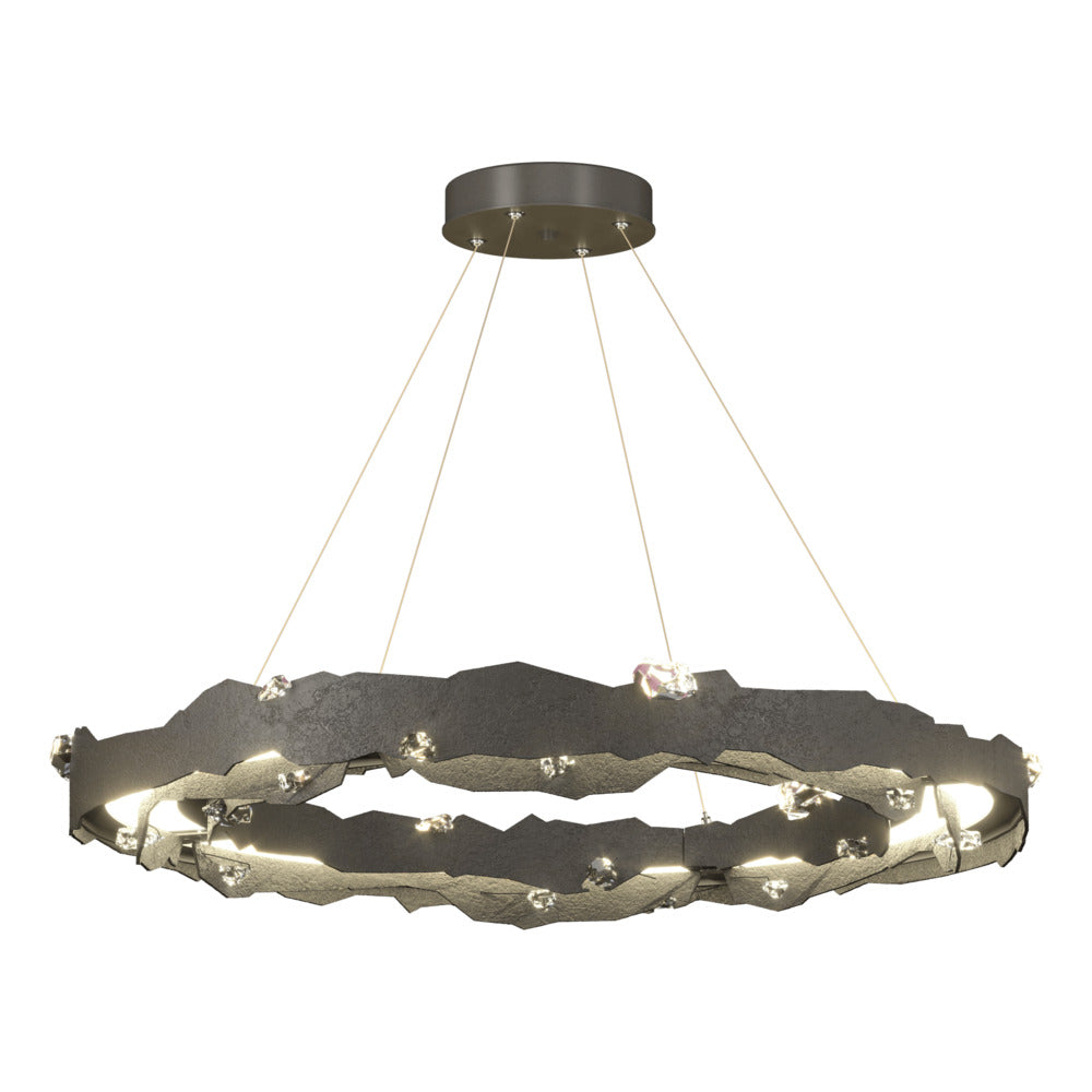 Design Team Leader Paul Marr Hilliard wanted to make a clear difference in the way crystals are used with the Trove LED Circular Pendant. "This is about geodes and the way the earth is broken open. This crystal shape is very raw and natural. Pairing that with our LED light-guide makes the crystals sparkle." With a 38.2" diameter, the Trove makes a statement with its large crystals like buried gems in the rugged, hand-forged steel "mountains".