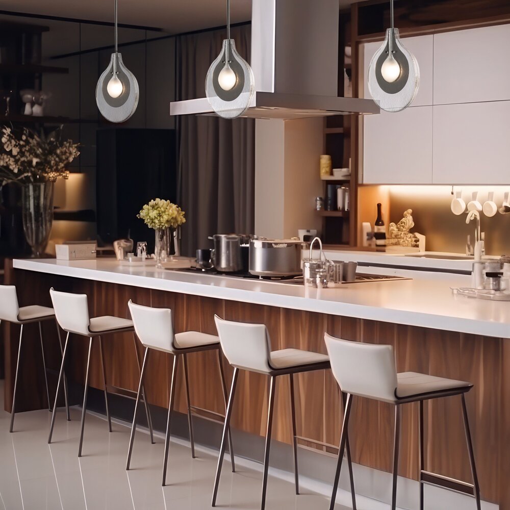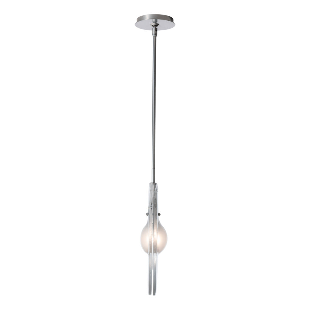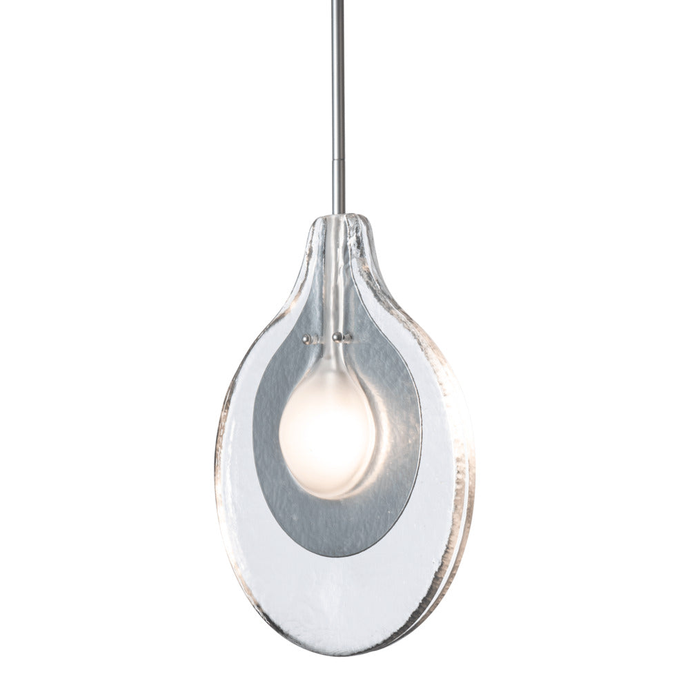 The use of Soiva glass from Venice was central to this design by HF's Jason Hancock. Two layers of handmade clear, textured glass encases a sculptural steel piece surrounding its bulb illumination. The frosted glass around the bulb gives a dimensionality to this single-light pendant. Part of the ART + ALCHEMY by Hubbardton Forge Collection.