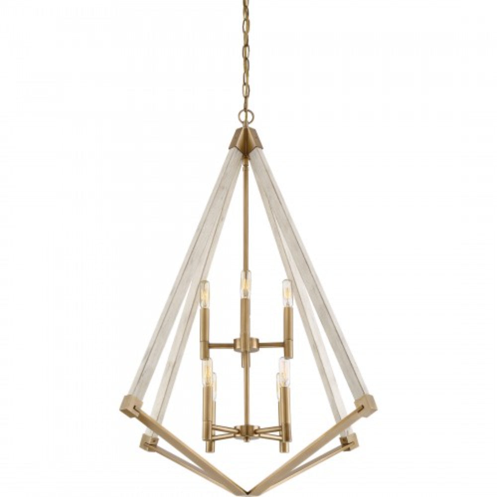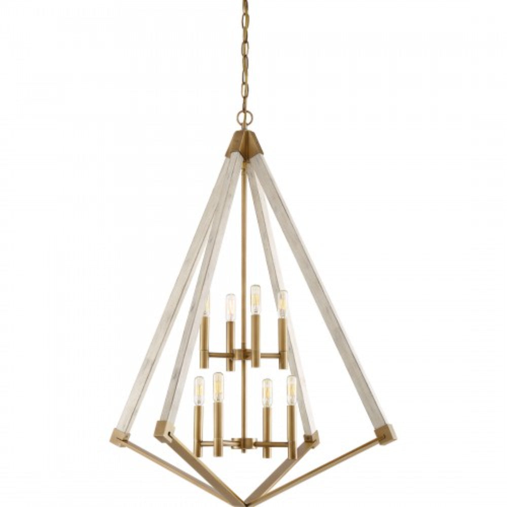 The bold lines and vintage finishes of the Viewpoint are a match made in design heaven! The inverted diamond silhouette features a faux wood frame in a whitewashed finish that is complemented by the soft brass hue of the accent caps and center column. Elongated candle sleeves and filament bulbs top off this splendidly charming collection.