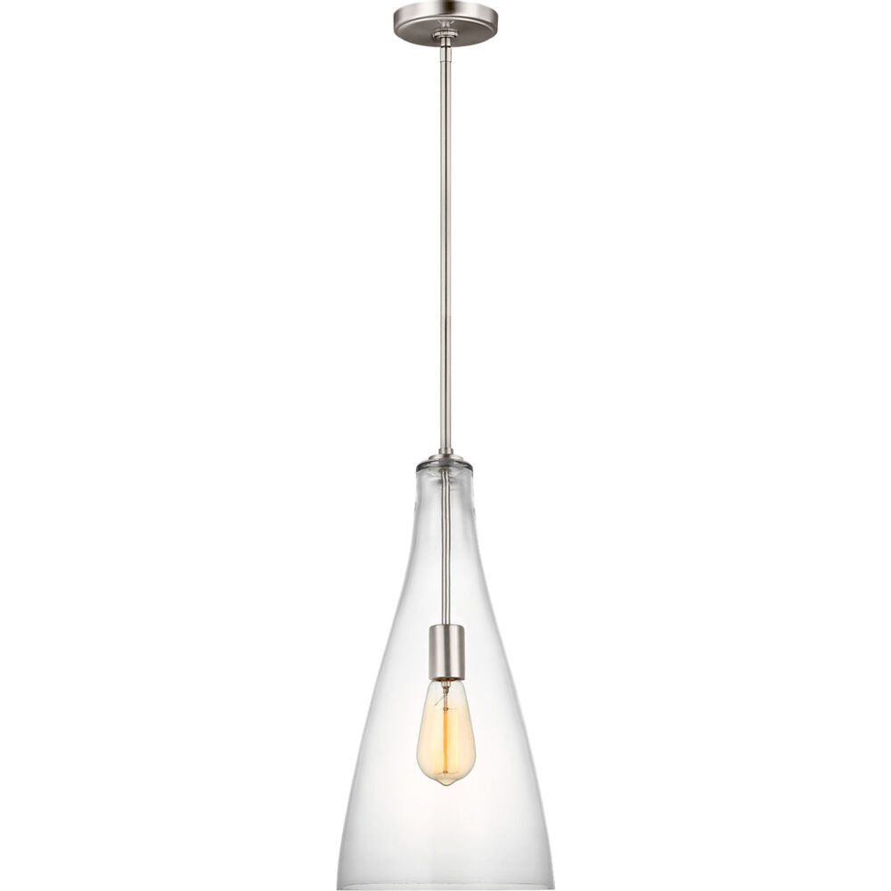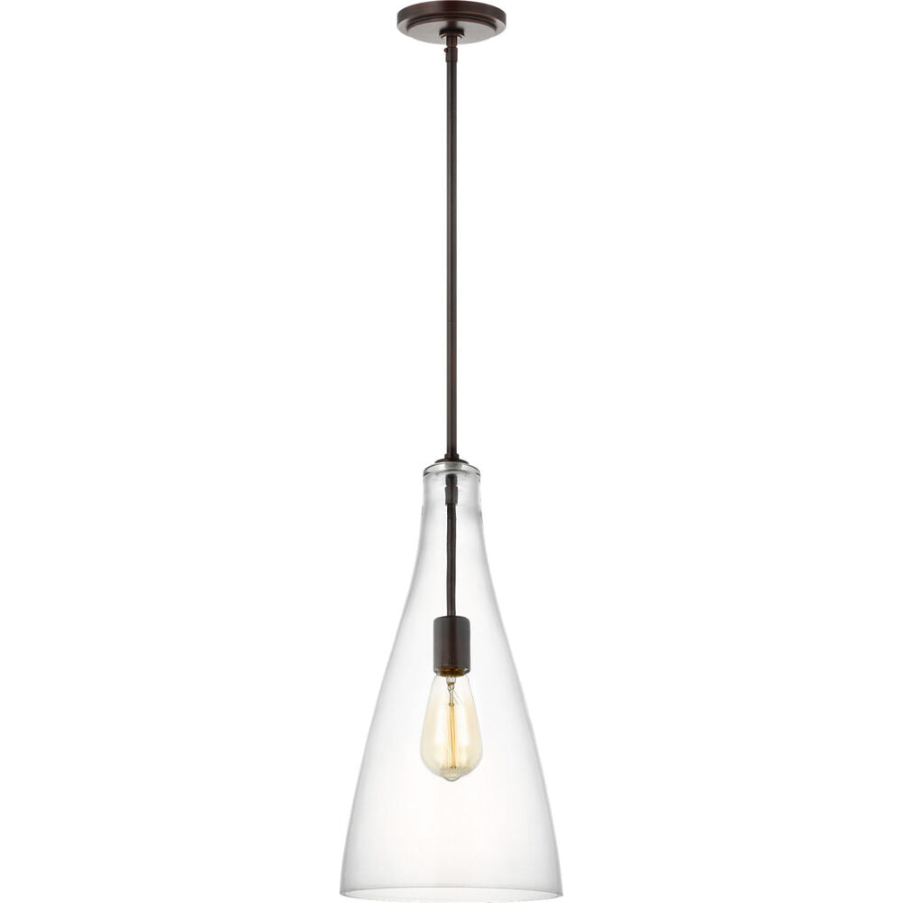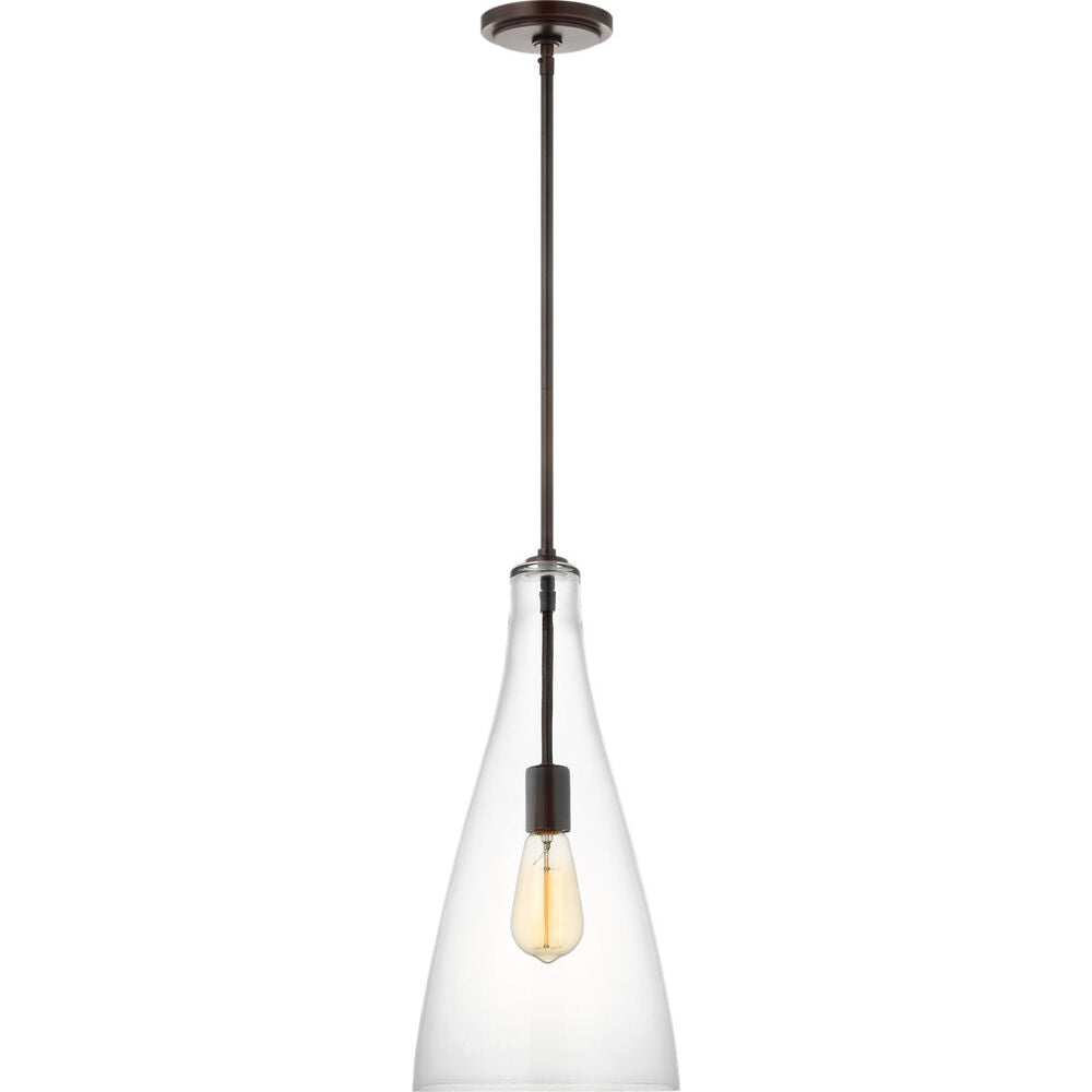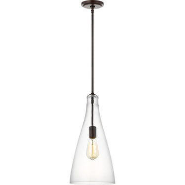 The Arilda one-light pendant series from springs to life with the fine artistry and technique of hand-blown glass. Spindle-inspired Clear glass shades give dimension and character to these traditional pendant lights. Paired with Edison-style bulbs, this pendant is a period-inspired classic to complement a wide range of decor from Colonial to nautical to rich, European inspired settings. Available in two hardware finishes, Heirloom Bronze and Brushed Nickel, Arilda pendants may be installed as single pendants or clustered in multiples, which would be an ideal installation used for entry lighting, dining room lighting, living room lighting or kitchen lighting over a table.