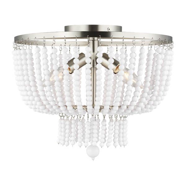 Adding an elegant texture to any room, the Jackie three light semi-flush mount is draped in a waterfall of white beads with brass or brushed nickel framework