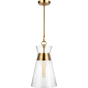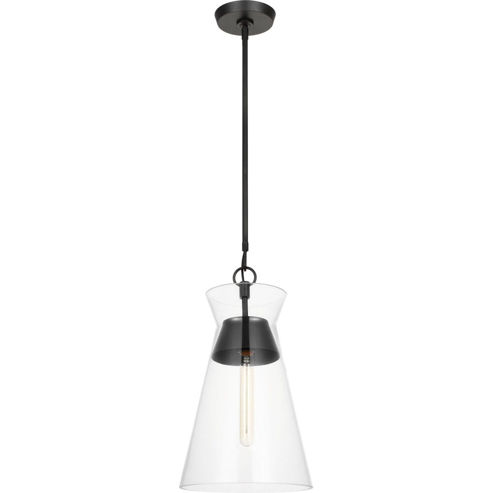 A modern take on classic schoolhouse lighting.Basic geometric forms, sphere and cone, made from clear mouth blown glass.The thick glass shade enhances the light from the bare filament bulb within.