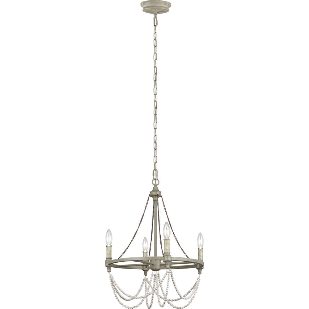 The Beverly Collection features a stunning combination of rustic, time-worn finishes like Distressed White Wood on the cascading beads.