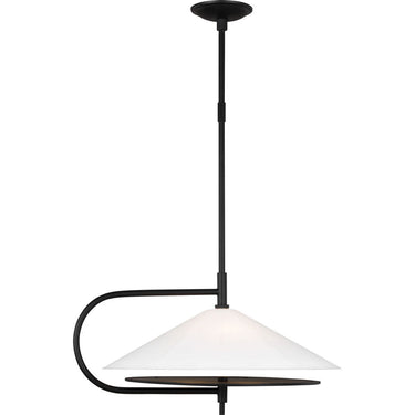 A dramatic and architectural take on Kelly's signature use of mixed metals and geometric forms, Gesture gives the appearance of asymmetrical balance. These refined and bold pendant lights juxtapose organic feminine curves with sleek masculine precision. The "C" arm hook holds an opal glass shade with a perforated metal diffuser at the base of the lamp. The diffuser shines light straight out and down, ensuring gentle, even distribution of the light. Available in three finish options: Aged Iron, Burnished Brass and Polished Nickel.