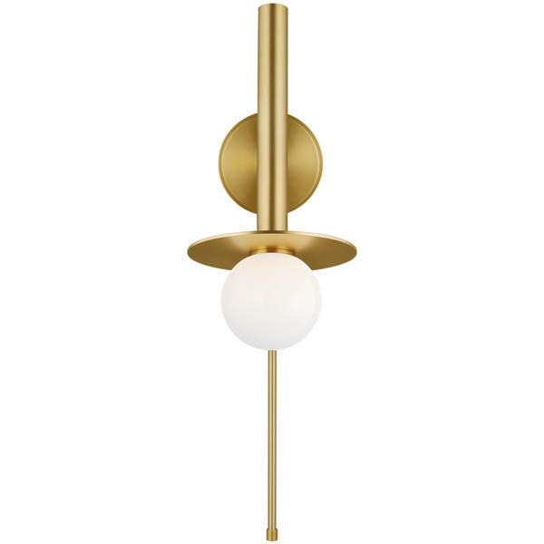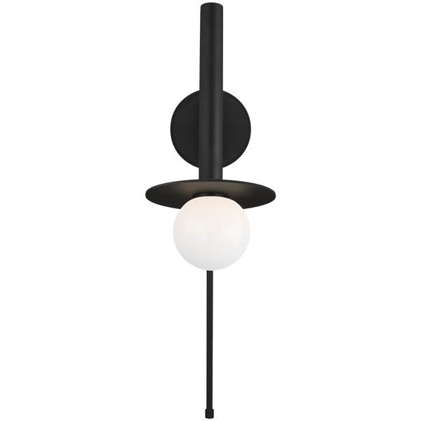 Nodes task, ceiling and wall lighting is minimal yet bold, highlighting Kelly's distinctive juxtaposition of mixed-materiality and curvilinear form. Light radiates from milk glass globes set against metal discs. All fixtures can be used or without the discs. The cast canopy is available in Burnished Brass or Midnight Black. Hanging fixtures within this family feature black fabric cords, while pivot sconces can be cord and plug or hard wire.