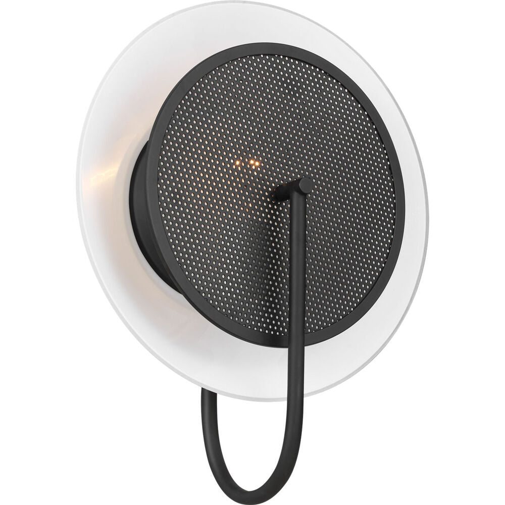 A dramatic and architectural take on Kelly's signature use of mixed metals and geometric forms, Gesture gives the appearance of asymmetrical balance. These refined and bold pendant lights juxtapose organic feminine curves with sleek masculine precision. The "C" arm hook holds an opal glass shade with a perforated metal diffuser at the base of the lamp. The diffuser shines light straight out and down, ensuring gentle, even distribution of the light. Available in three finish options: Aged Iron, Burnished Brass and Polished Nickel.