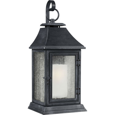 The Shepherd outdoor lighting series features a decorative shepherd's crook, a latched and hinged front door panel, an inner Case White glass shade, Clear Seeded outer glass to create the visual appearance of vintage gas lanterns.