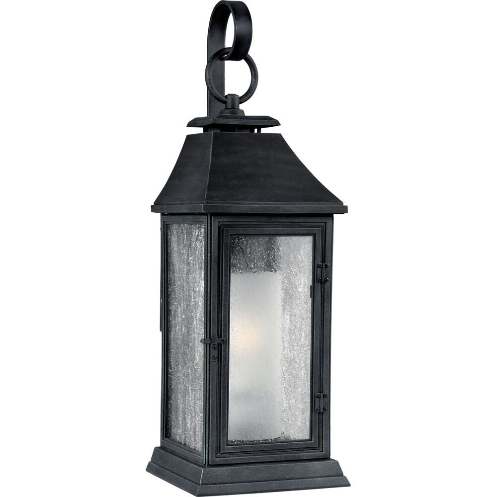 The Shepherd outdoor lighting series features a decorative shepherd's crook, a latched and hinged front door panel, an inner Case White glass shade, Clear Seeded outer glass to create the visual appearance of vintage gas lanterns.
