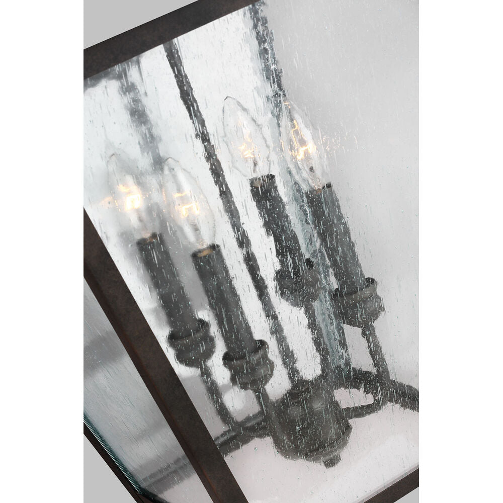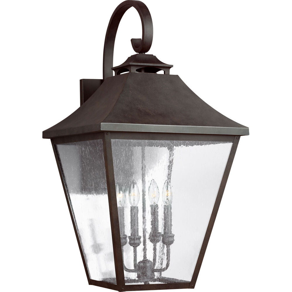 Galena is a Europe-inspired classic lantern. Simple and refined, Galena features a gently curved hook detail atop a vented, square-off roofline, and candle tubes floating within the tapered Clear Seeded glass shades.