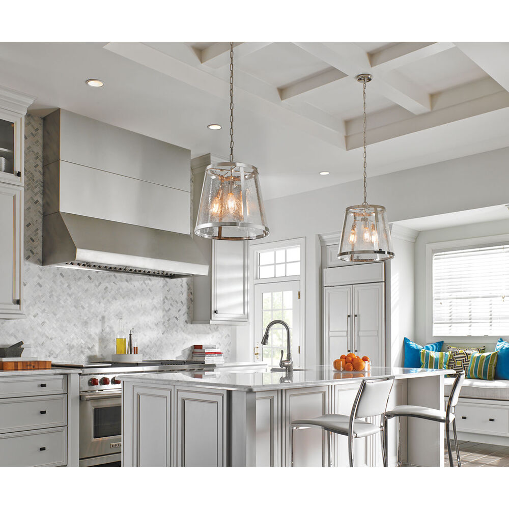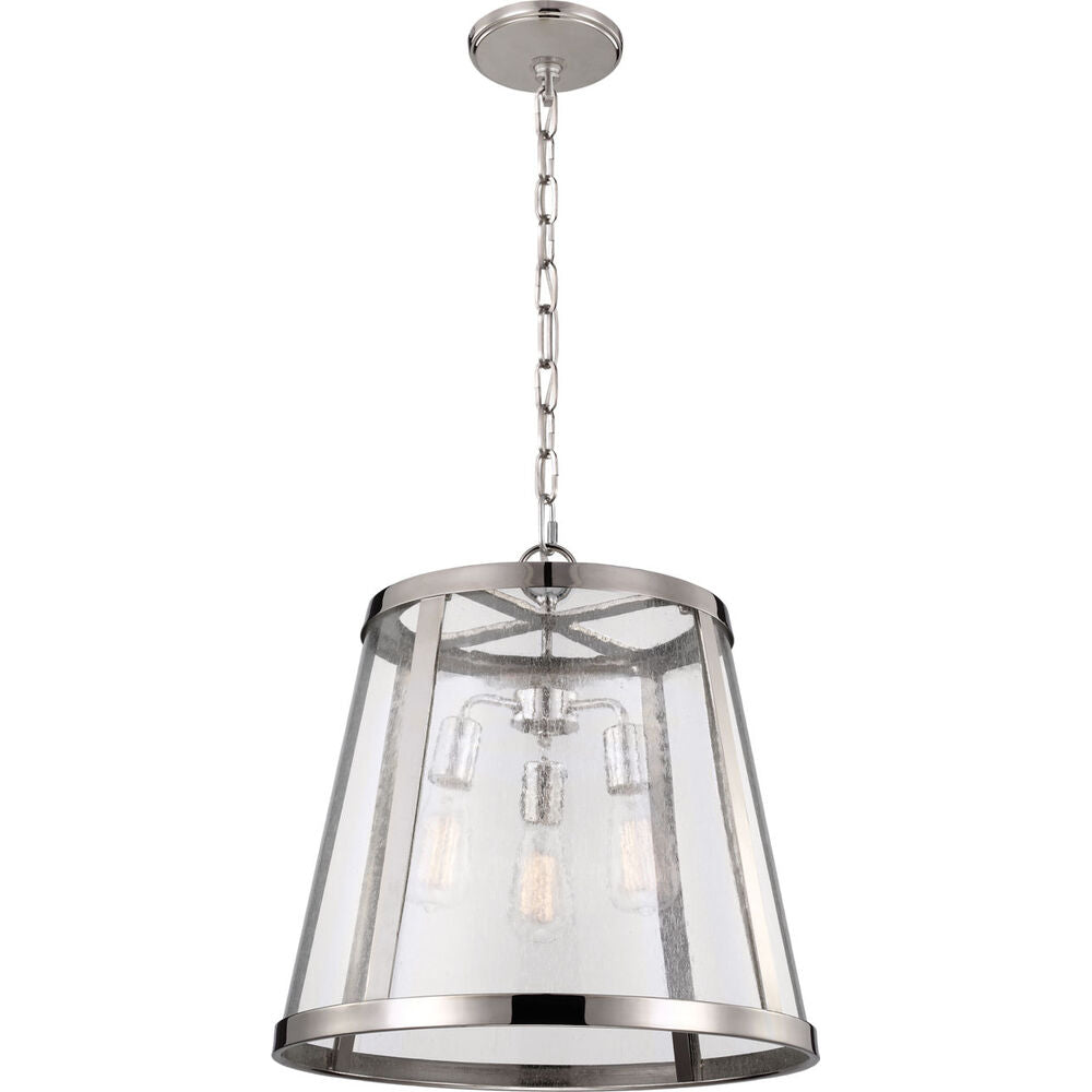 Combining the traditional profile of a tapered shade with on-trend Clear Seeded glass, the sleek frame and the square-linked chain give the Harrow pendant lighting seriesan elevated, contemporary transitional look.