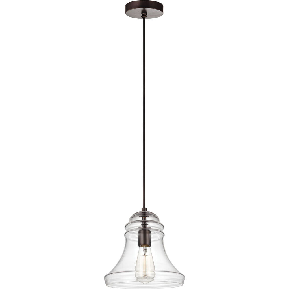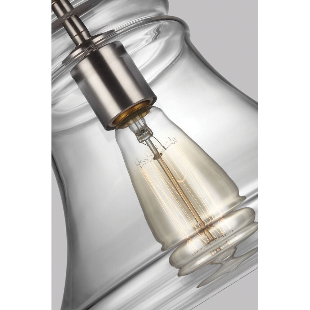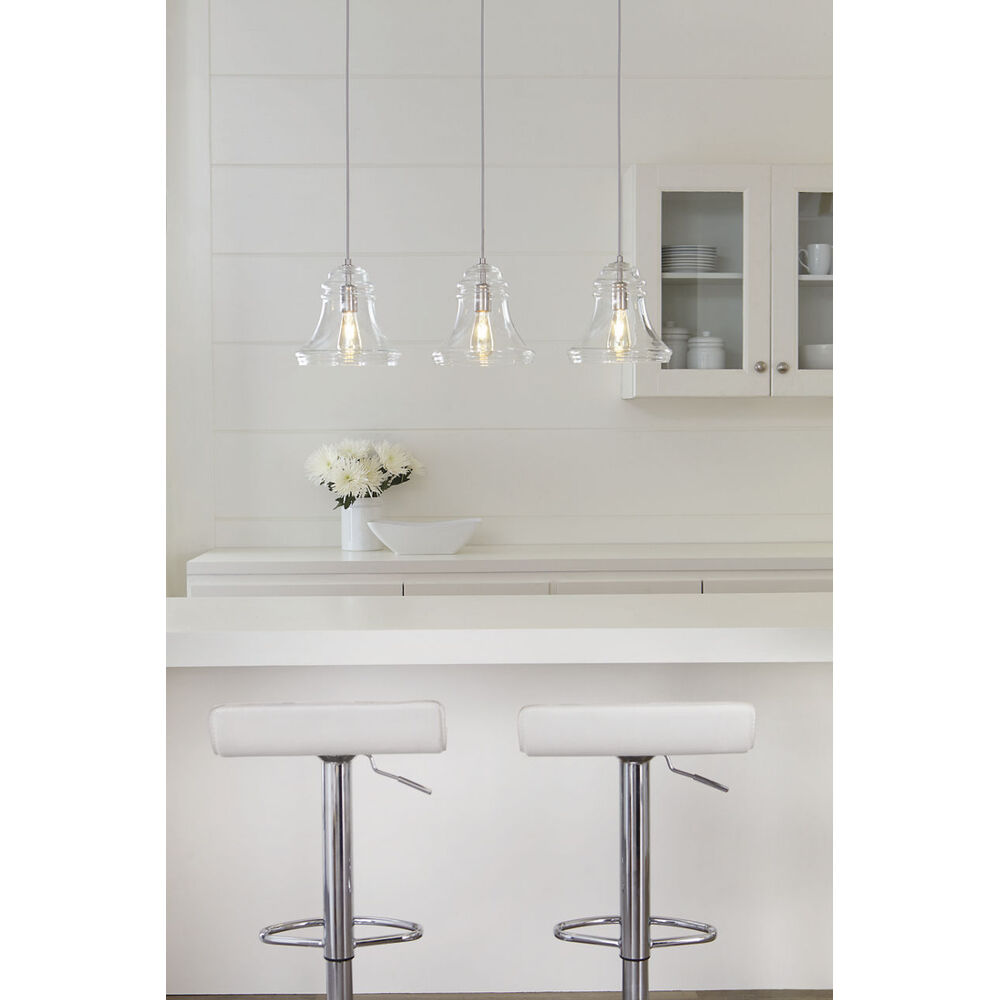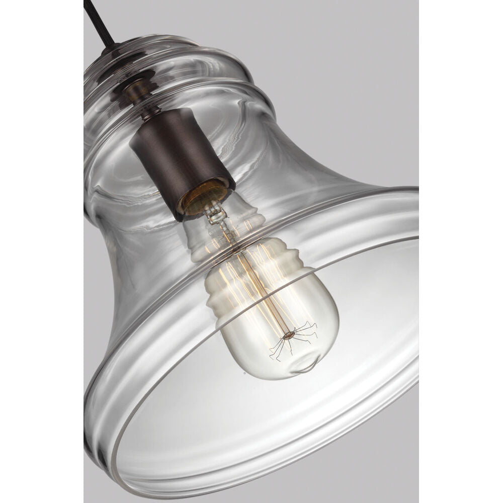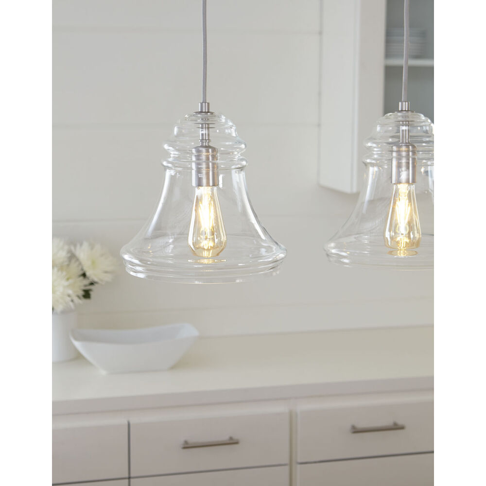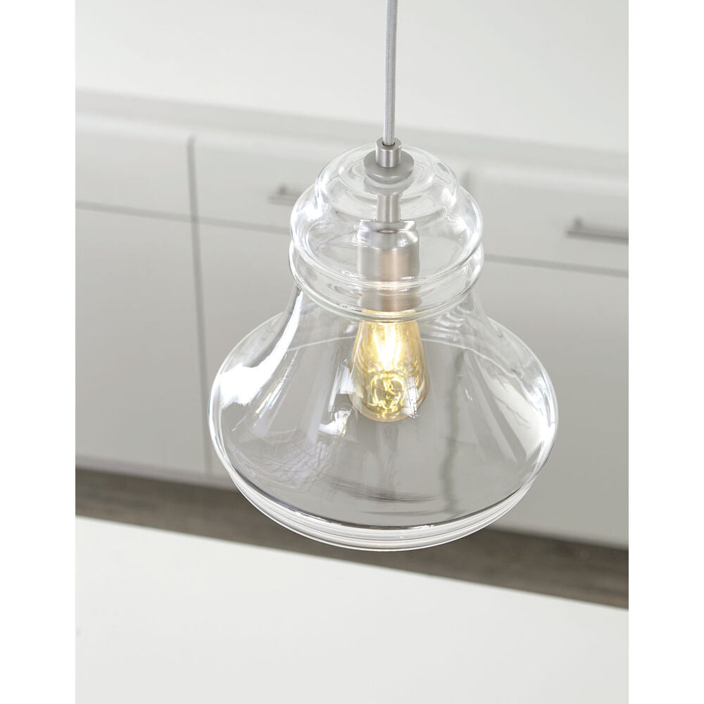 The Doyle one-light mini pendant springs to life with the fine artistry and technique of hand-blown glass. Spindle-inspired Clear glass shades give dimension and character to these traditional pendant lights. Paired with Edison-style bulbs, this mini pendant is a period-inspired classic to complement a wide range of decor from Colonial to nautical to rich, European inspired settings. Available in two sizes and two hardware finishes, Oil Rubbed Bronze and Satin Nickel, Doyle mini pendants may be installed as single pendants or clustered in multiples using a Multi-Port canopy, which would be an ideal installation used for entry lighting, dining room lighting, living room lighting or kitchen lighting over a table.