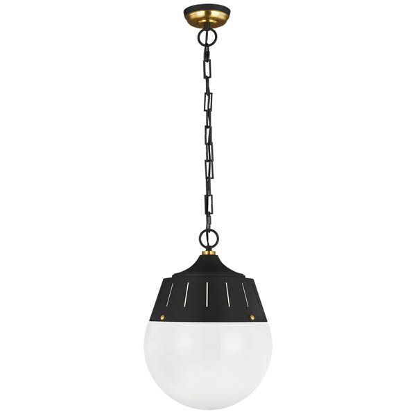 Acorn-shaped pendant made of hand-blown, white milk glass suspended from a metal upper shade with slit details