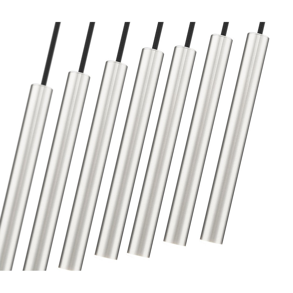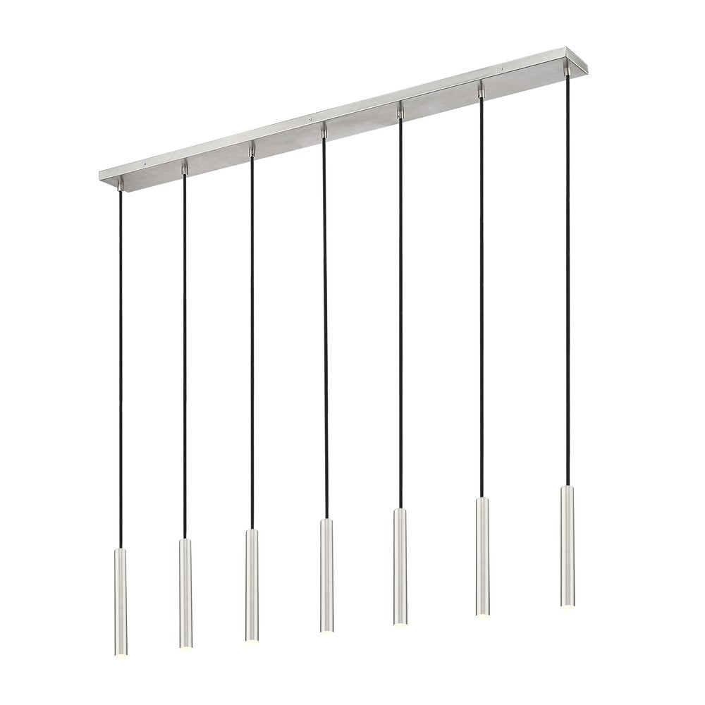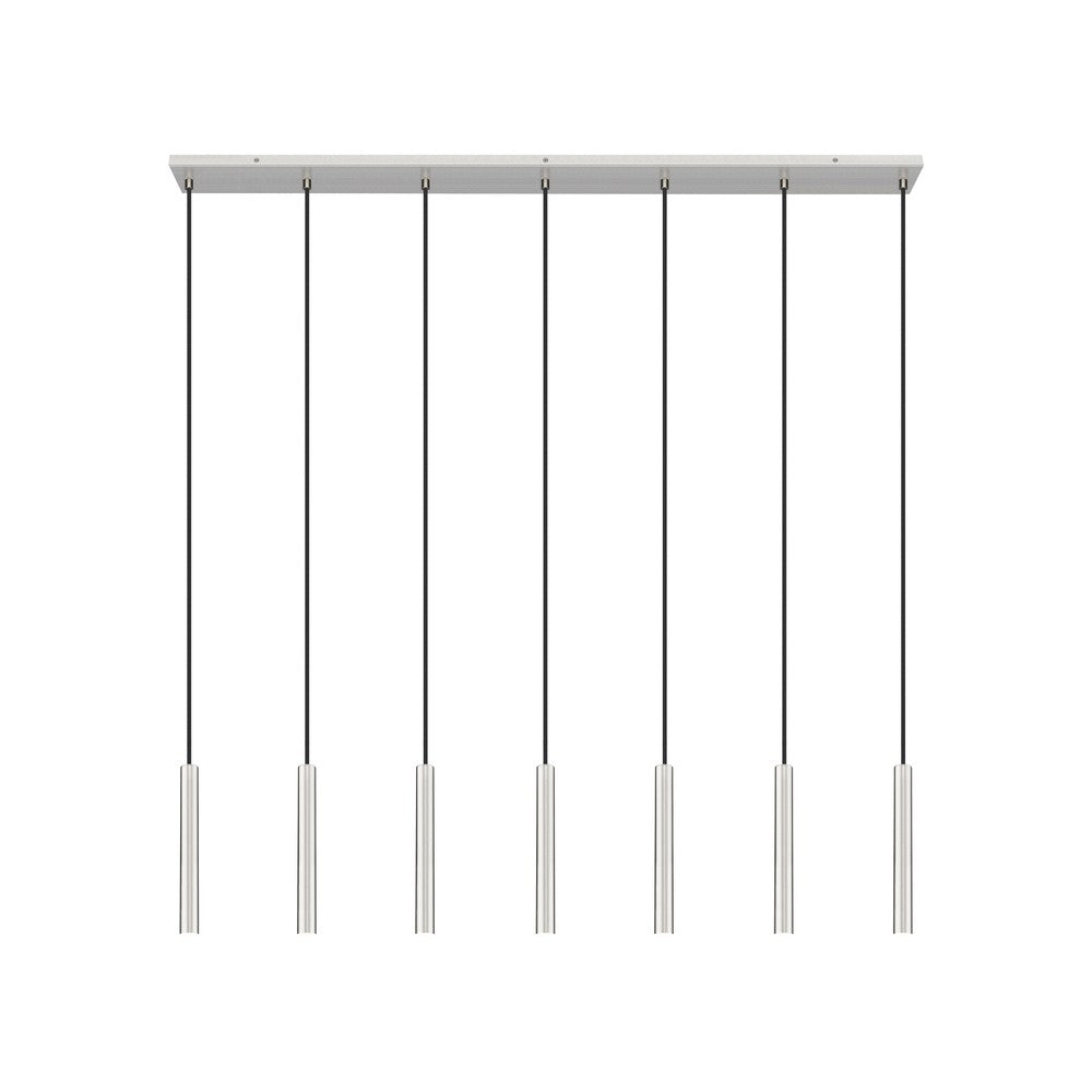 Add elegant illumination over a kitchen island or gaming table with a modern seven-light linear chandelier. It features integrated LED lights in slim housings, creating a minimalist profile for this brushed nickel finish fixture. The lights are dimmable to a choice the perfect ambiance for every occasion.