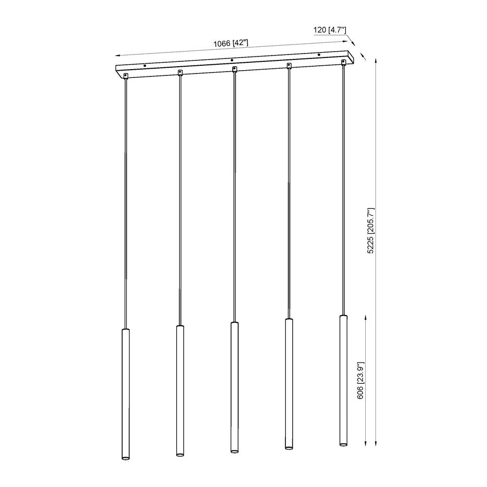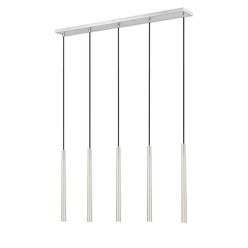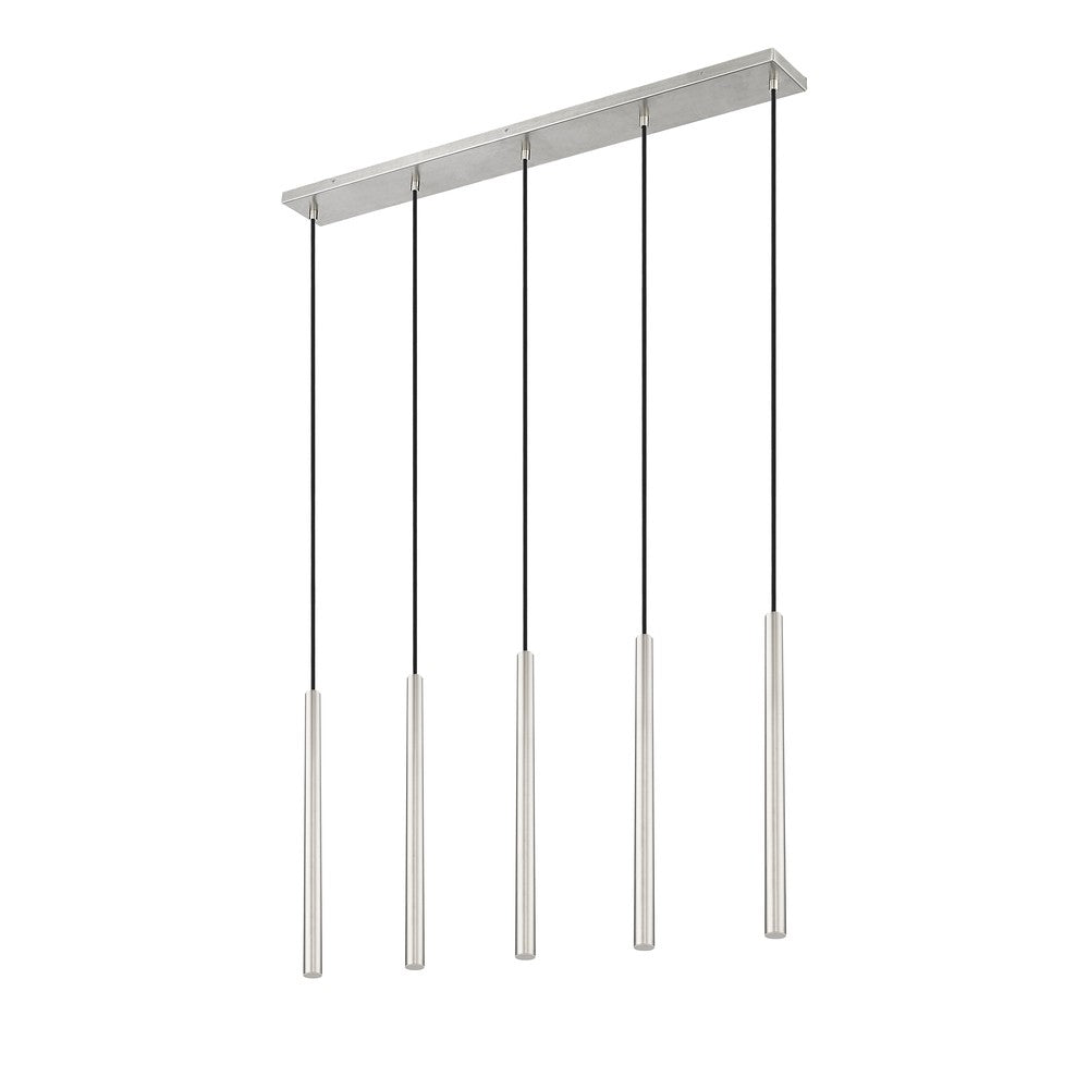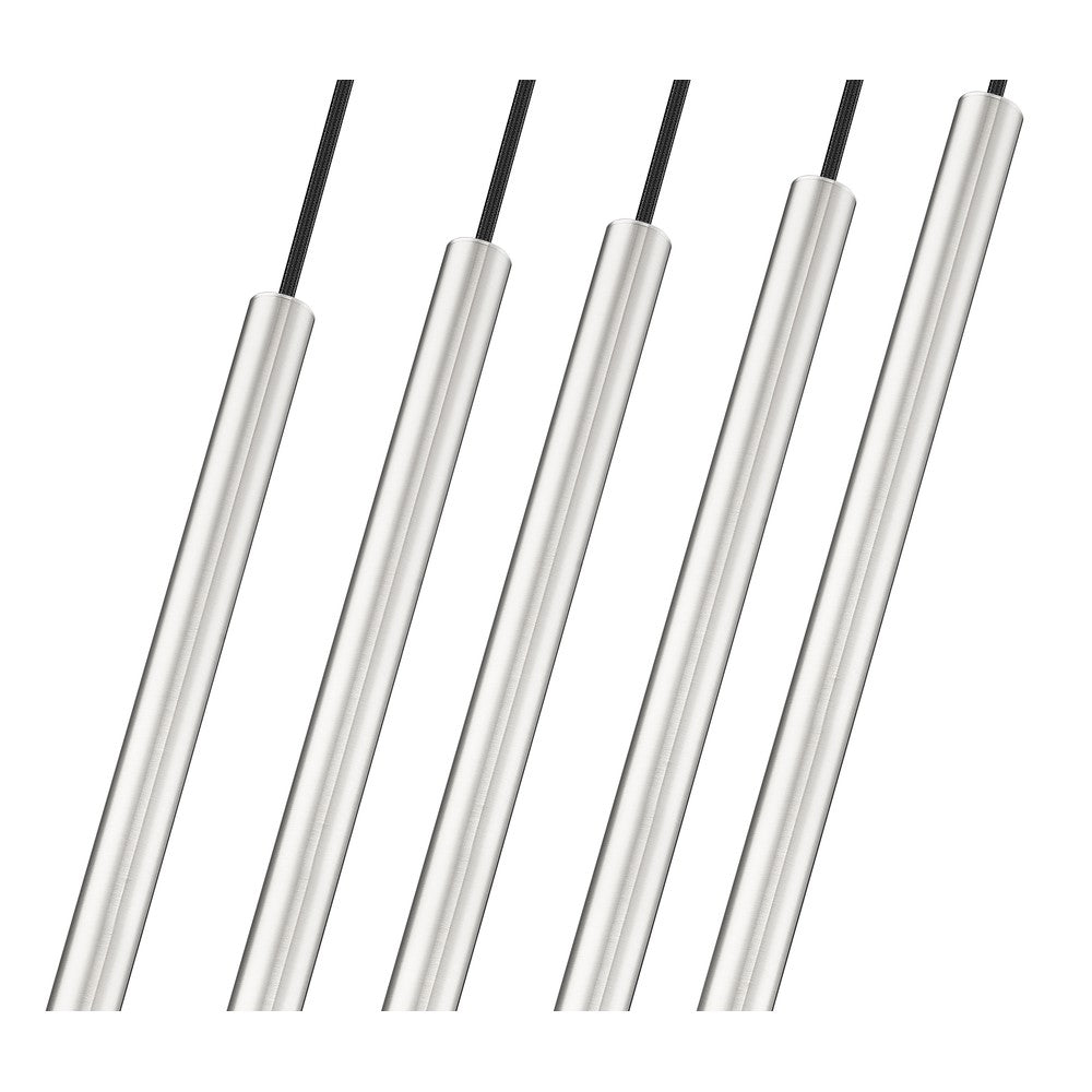 Slim, extra-long light housings bring graceful, contemporary energy to this modern five-light linear chandelier. It's the perfect choice for a modern kitchen island or dining table, offering soft illumination and a versatile brushed nickel finish. Its integrated LEDs deliver dimmable, energy efficient illumination and a wonderful ambiance for everyday and entertaining.
