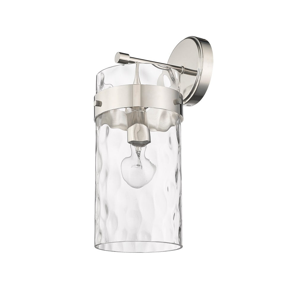 Illuminate dark hallways and bathrooms with this wall sconce. This fixture flaunts a cylindrical glass shade with a romantic ripple texture. Steel construction is enhanced with a brushed nickel finish.