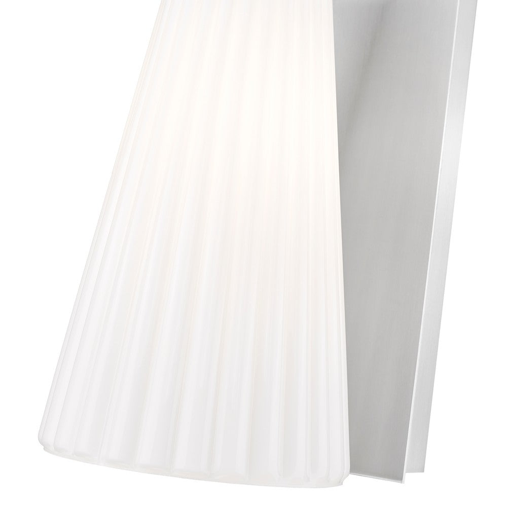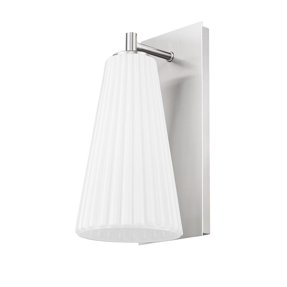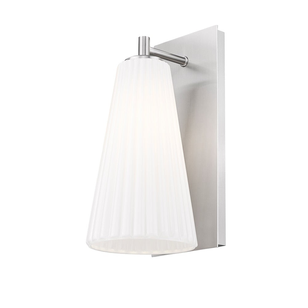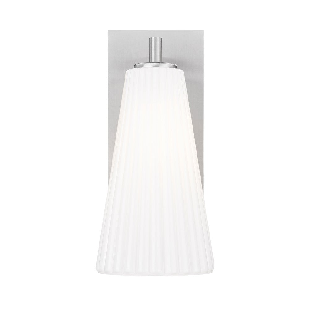 Showcasing radiant luminosity and a sleek silhouette, this modern one-light wall sconce is a standout choice for your living space. Its shade is crafted from delicate fluted white glass that creates a cool, sophisticated vibe. A rectangular backplate and arm feature a fresh brushed nickel finish that's sure to complement a surrounding decor.