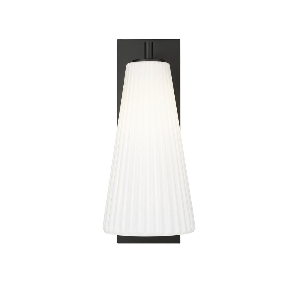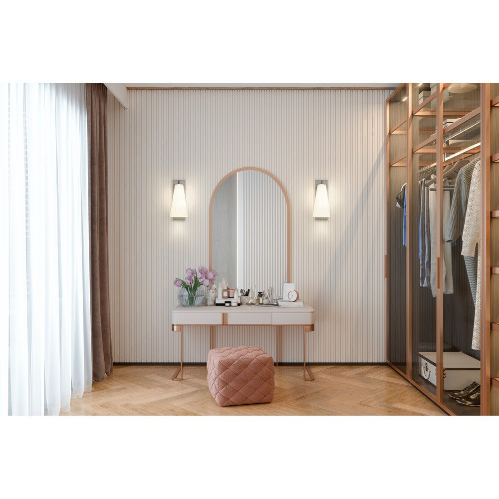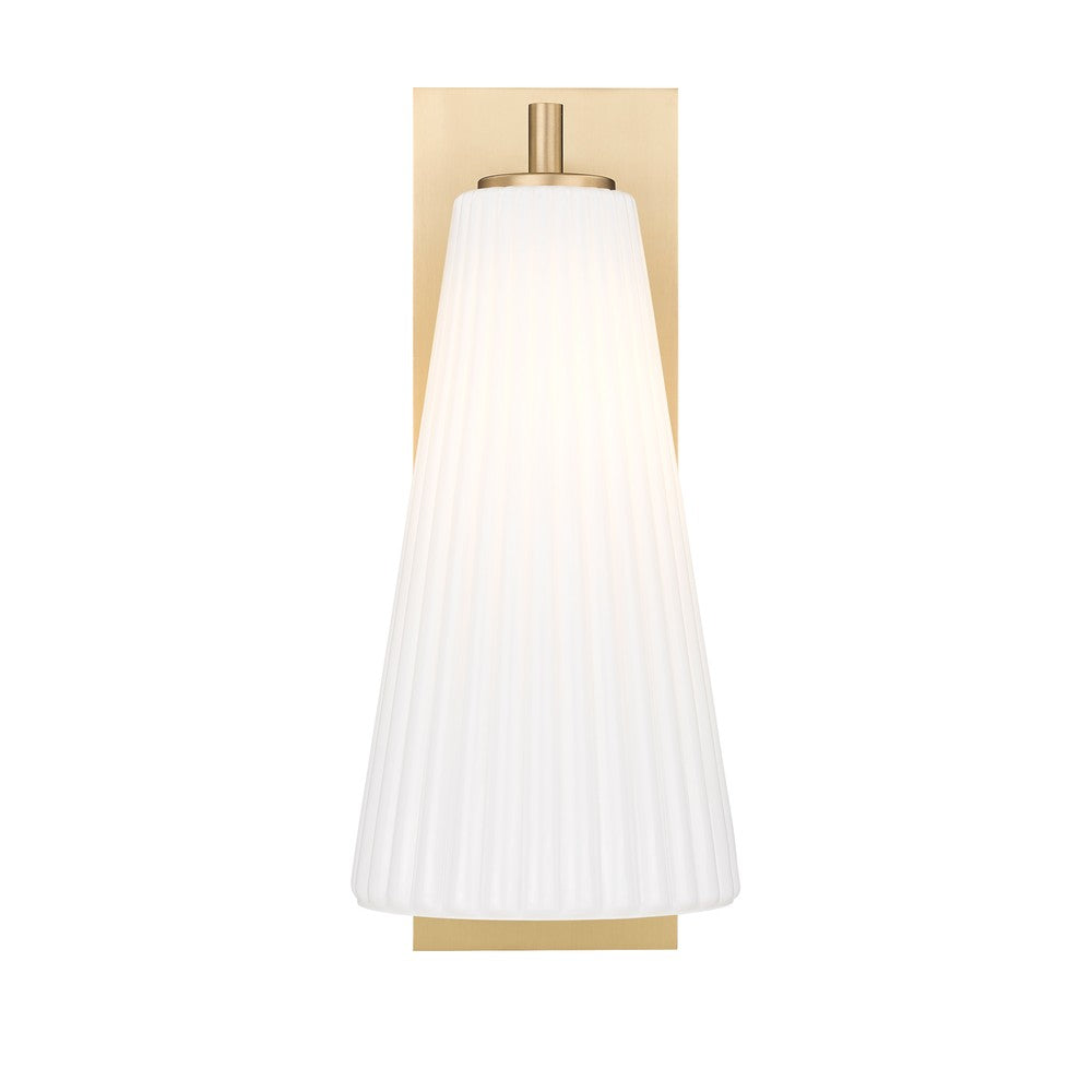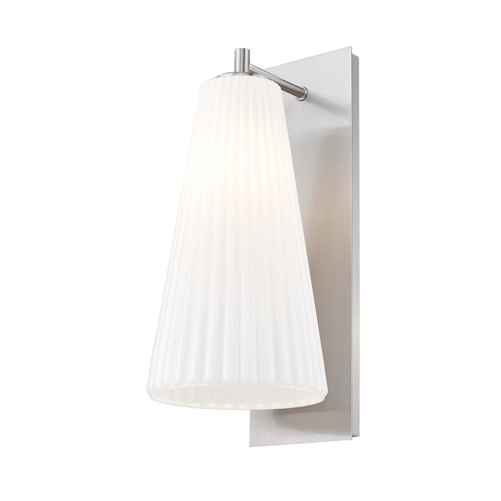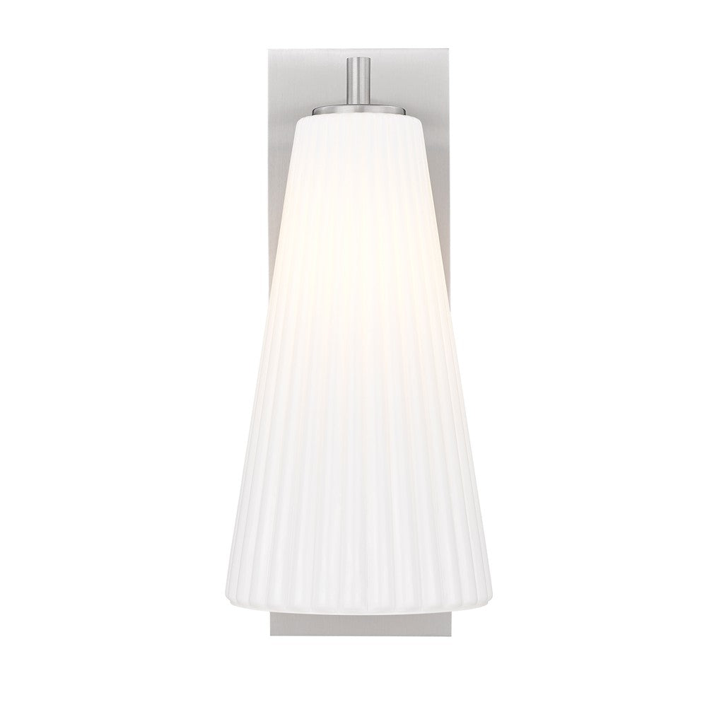 Radiant light and an elongated silhouette become the hallmarks of a modern one-light wall sconce from the Farrell collection. Delicate fluted white glass creates a cool, sophisticated vibe while a backplate and arm feature a fresh brushed nickel finish that's sure to complement the surrounding decor in your living area, foyer, or bedroom.