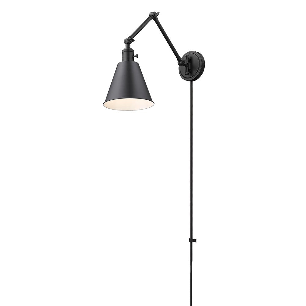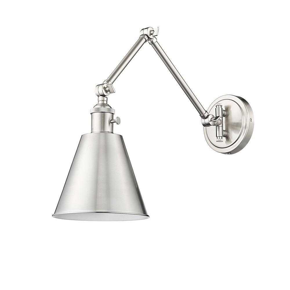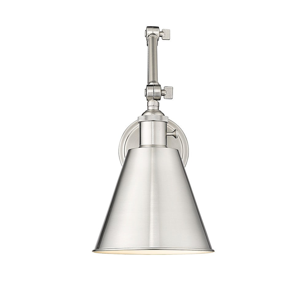 Mixed motifs offer an exquisite form of industrial style in a one-light wall sconce offering the perfect blend of glam and industrial design aesthetics. Constructed of cool brushed nickel steel framing and a matching steel conical shade, it delivers utility in an adjustable configuration making it easy to achieve customizable lighting levels. Install through hard-wiring or install cord-and-plug mounting to allow movement from space to space.