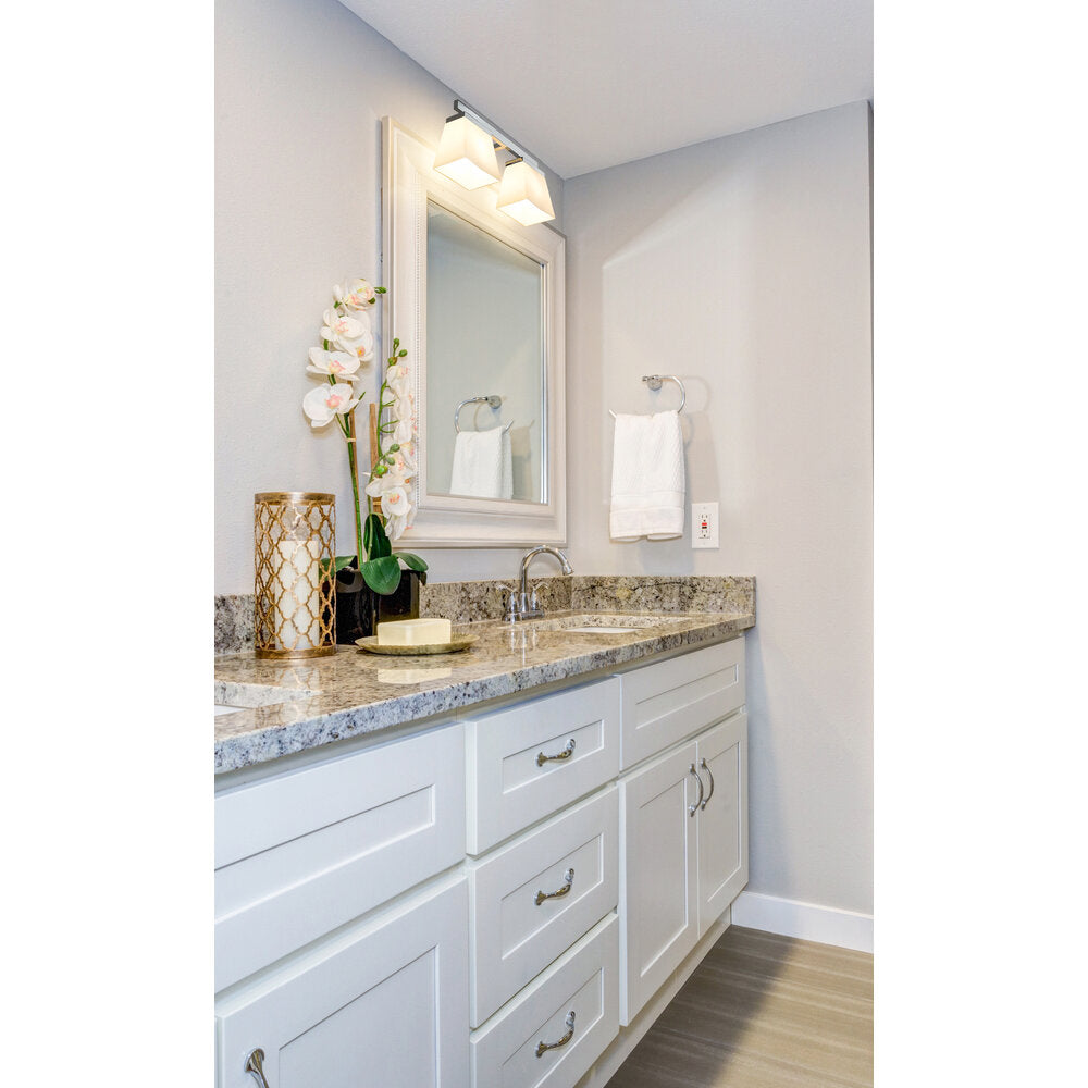 Modern and sleek, the Astor Collection of vanity fixtures can enhance a myriad of designs from industrial to Modern Farmhouse, depending on the glass style (smooth opal or ribbed crystal) and finish (Matte Black, Chrome, or Brushed Nickel) selected.