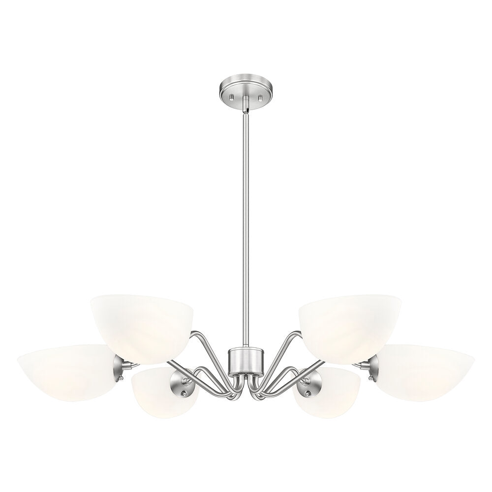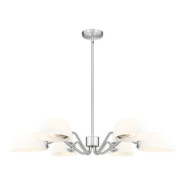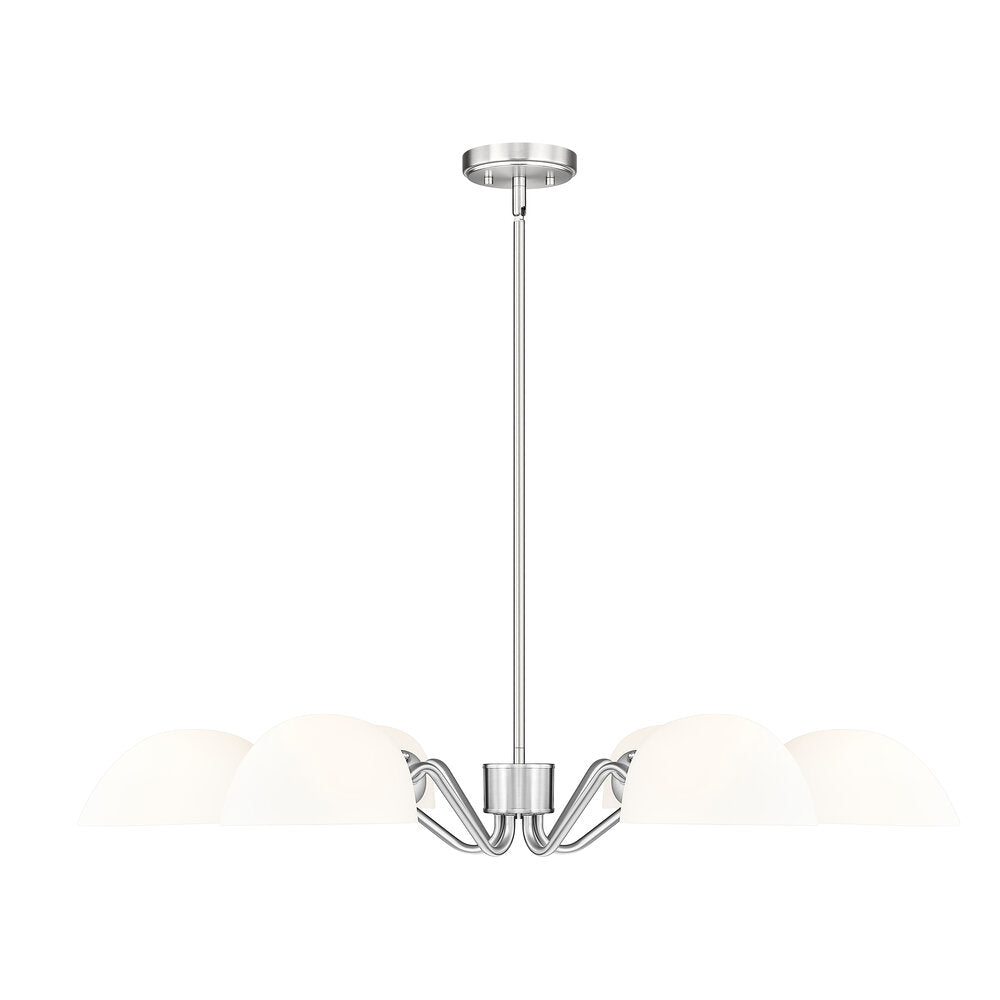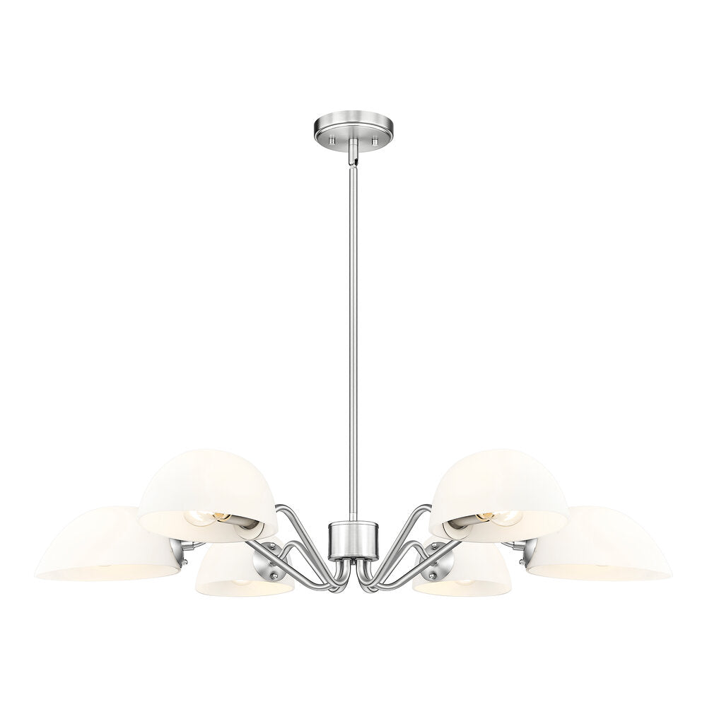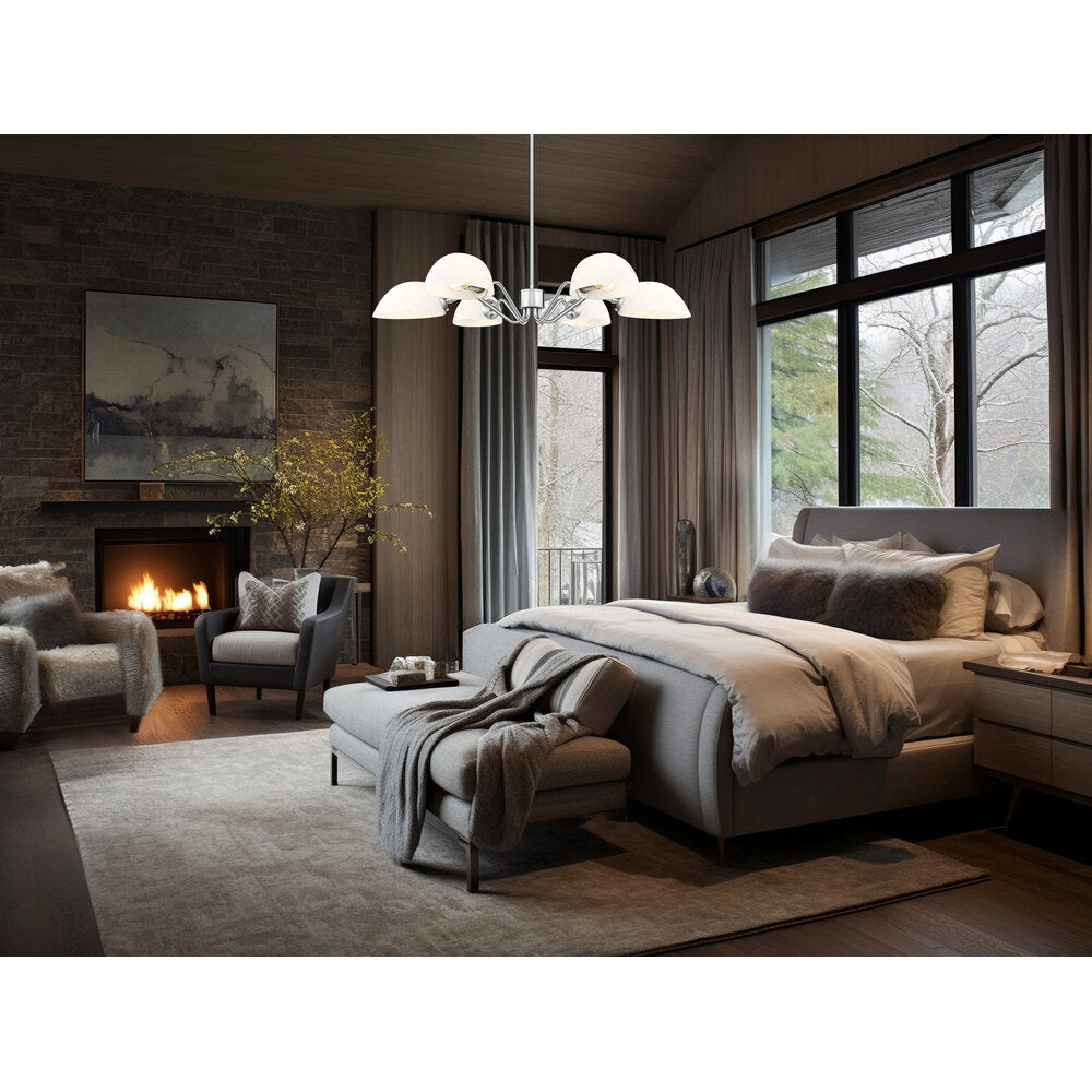 Modern meets classic in a chic six-light chandelier with curvy arms and domed opal glass shades. Perfect for living and dining spaces, it adds versatility with shades that can be positioned to cast up or down lighting to best suit the needs of your space. A brushed nickel finish adds timeless character and sleek style to complement in virtually any home.