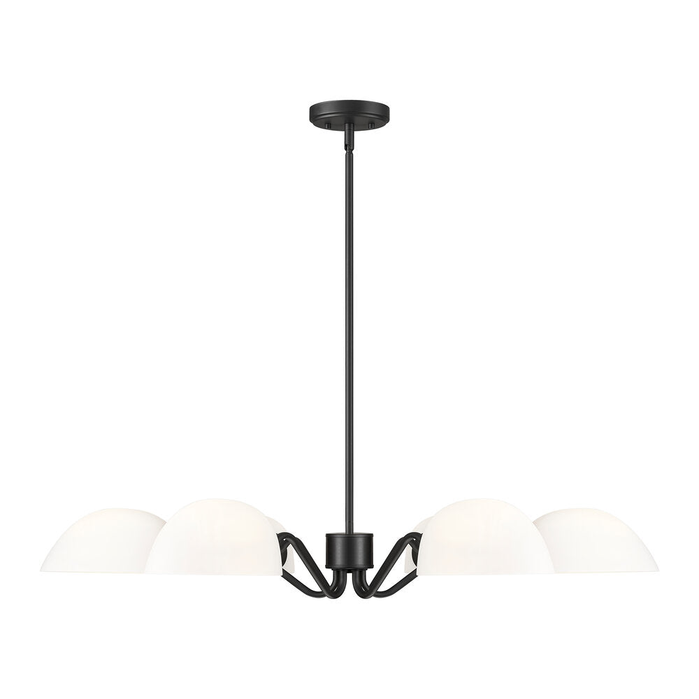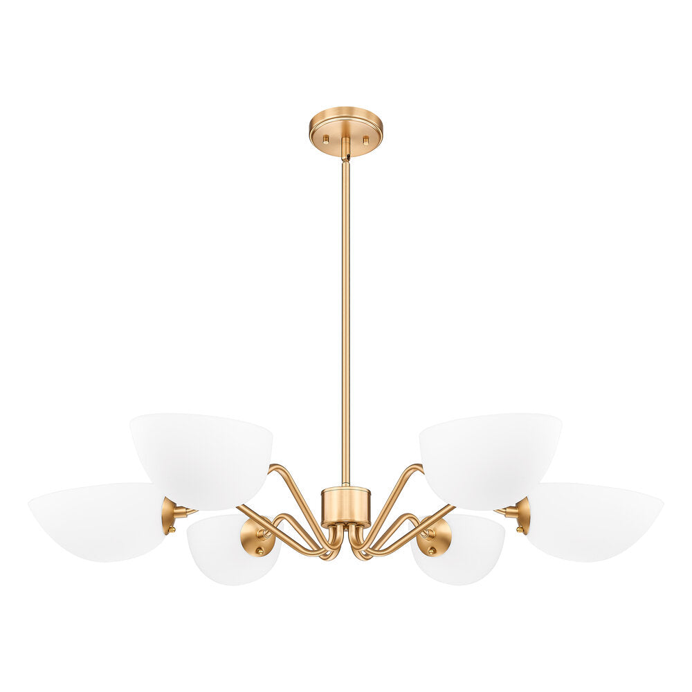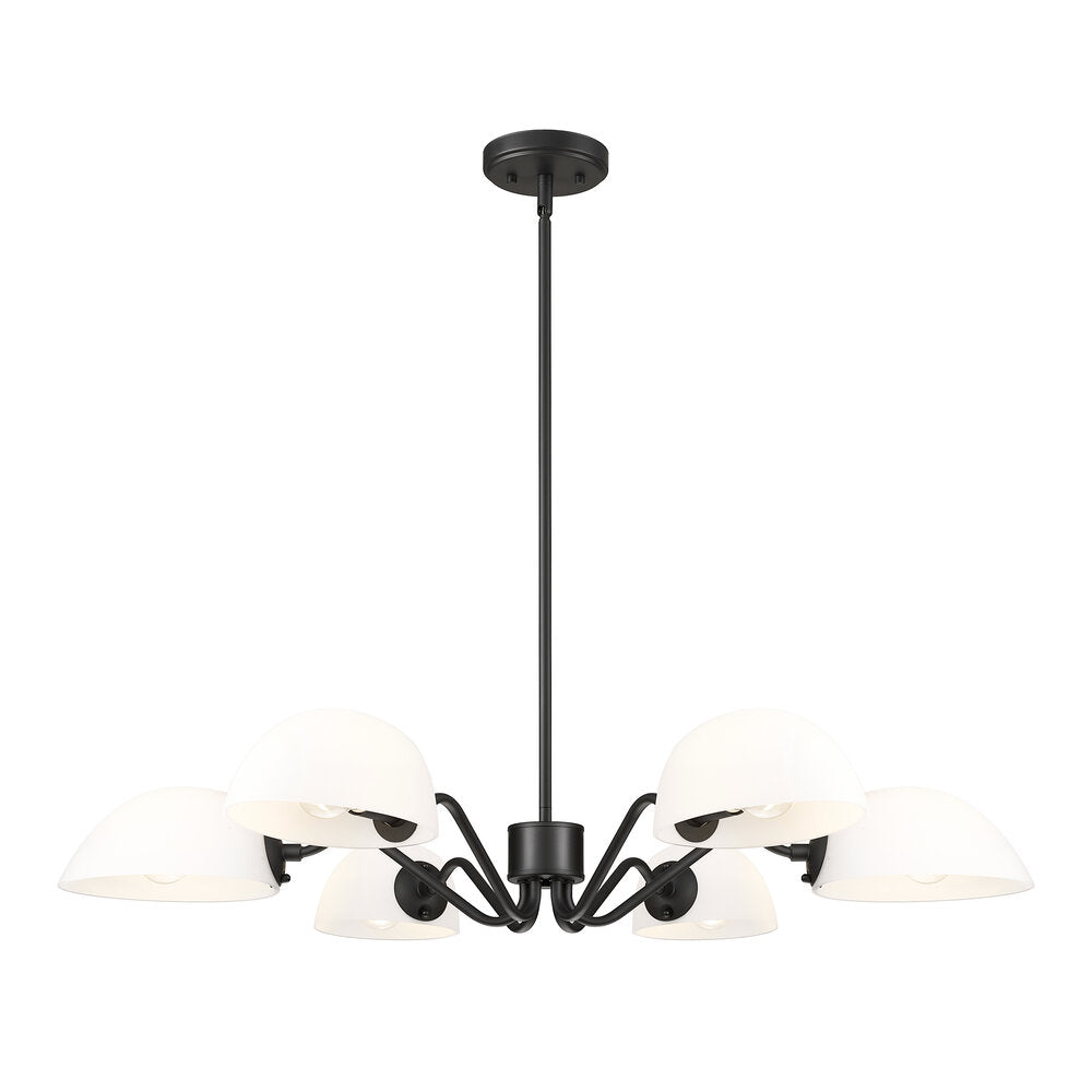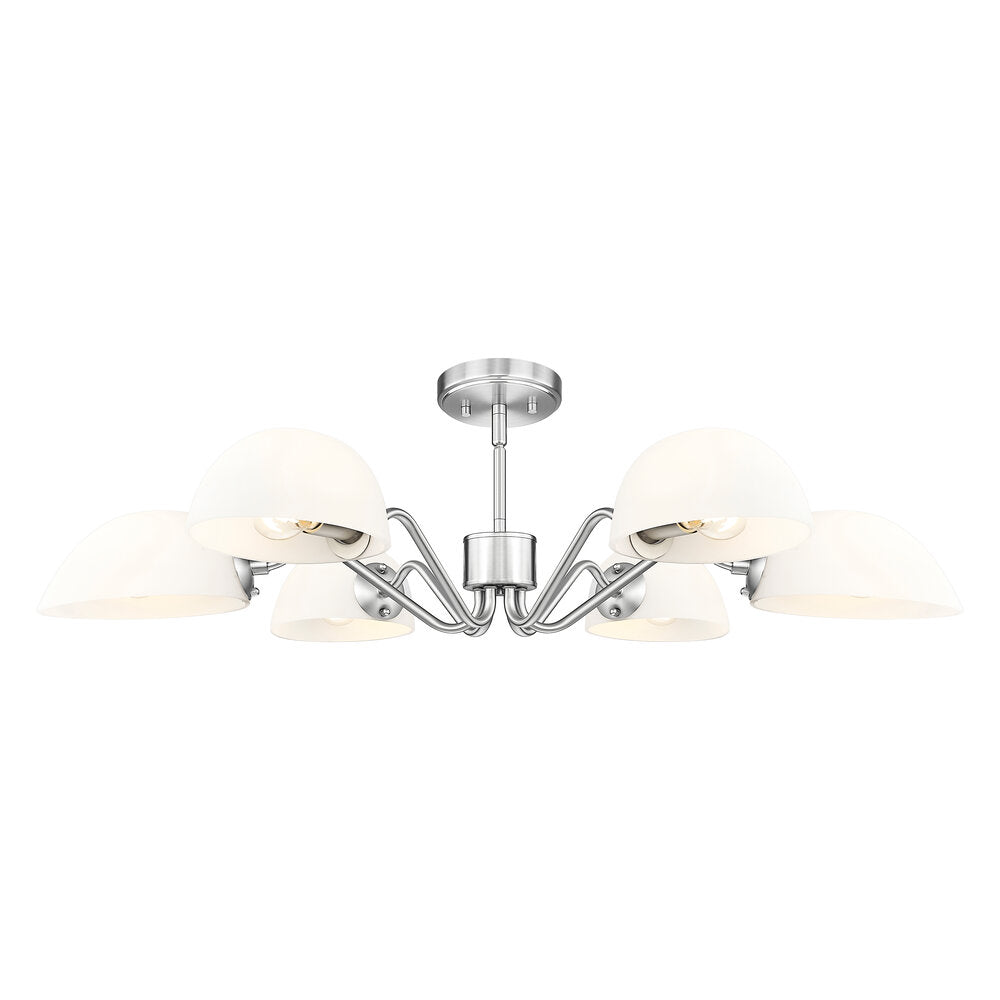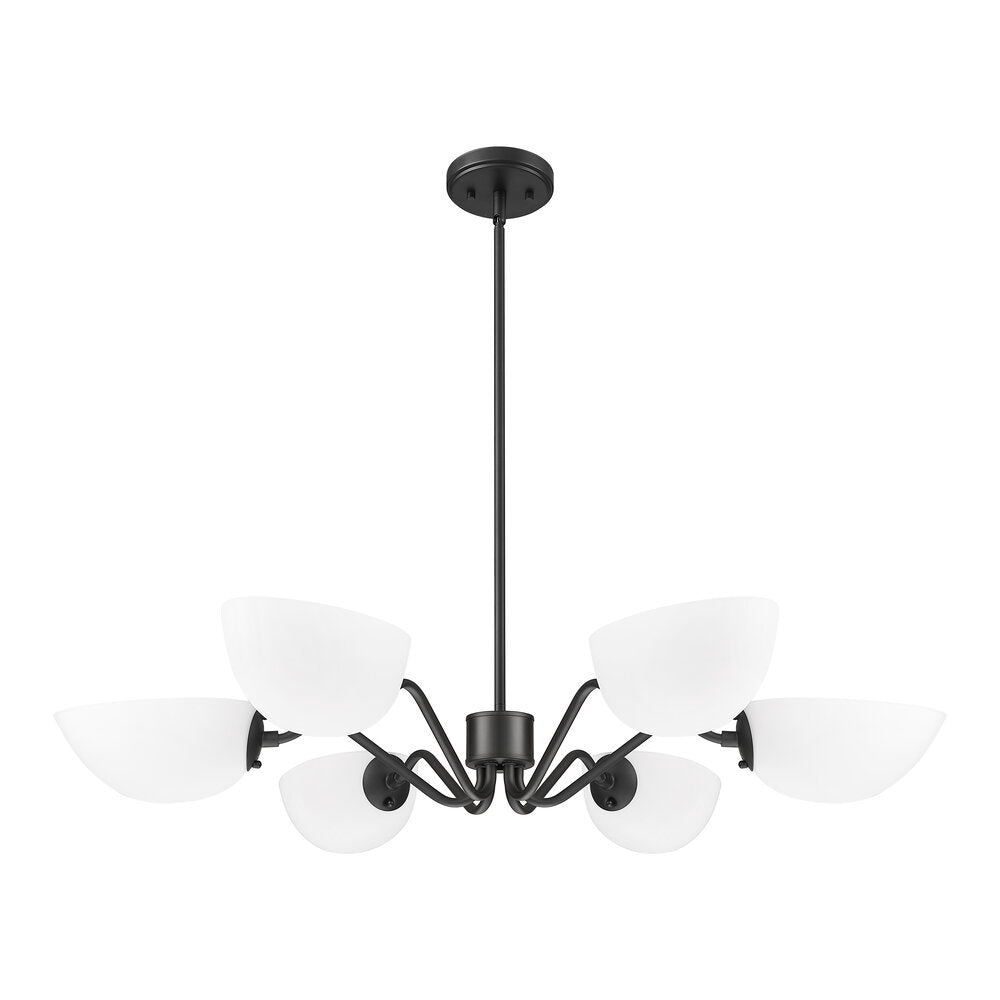 Modern meets classic in a chic six-light chandelier with curvy arms and domed opal glass shades. Perfect for living and dining spaces, it adds versatility with shades that can be positioned to cast up or down lighting to best suit the needs of your space. A brushed nickel finish adds timeless character and sleek style to complement in virtually any home.