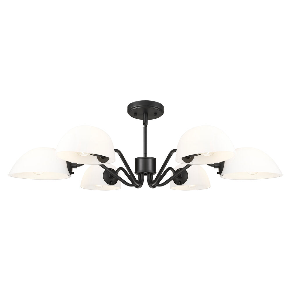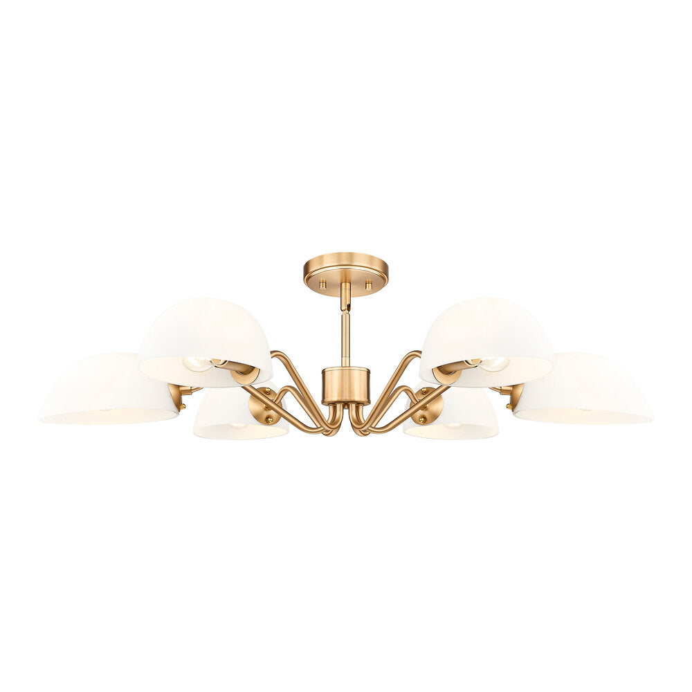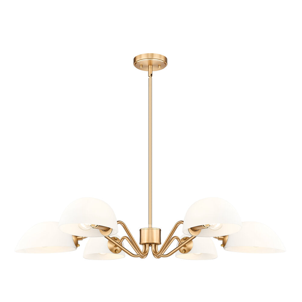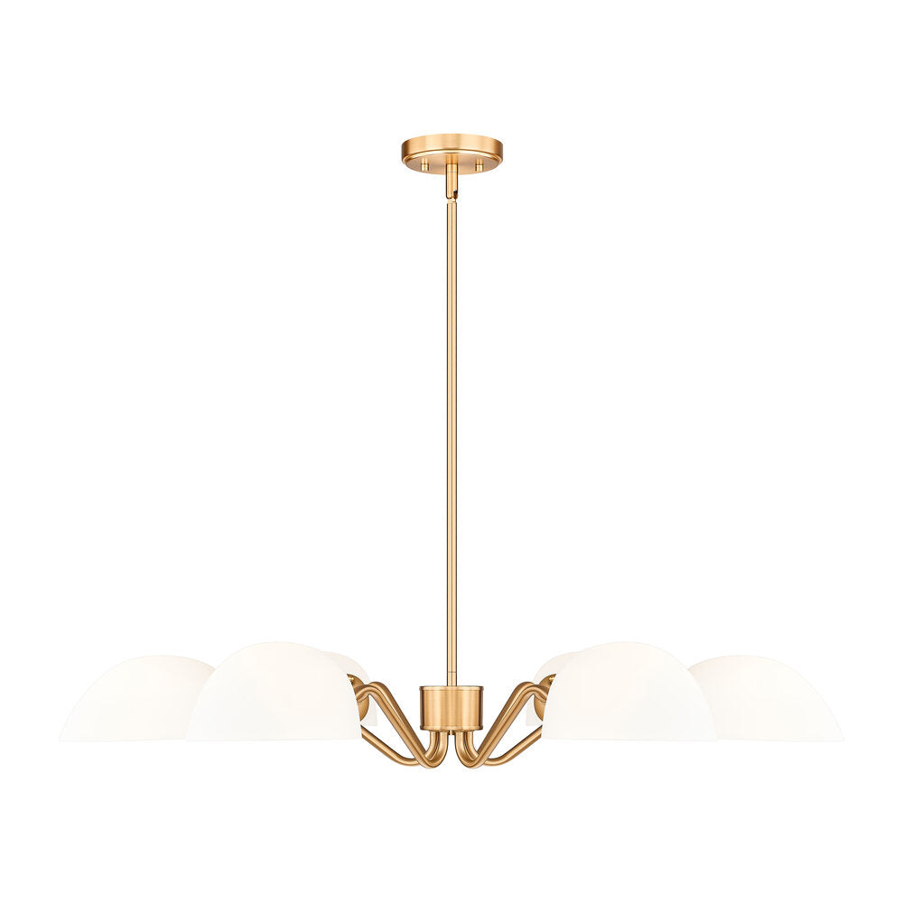 Modern meets classic in a chic six-light chandelier with curvy arms and domed opal glass shades. Perfect for living and dining spaces, it adds versatility with shades that can be positioned to cast up or down lighting to best suit the needs of your space. A brushed nickel finish adds timeless character and sleek style to complement in virtually any home.