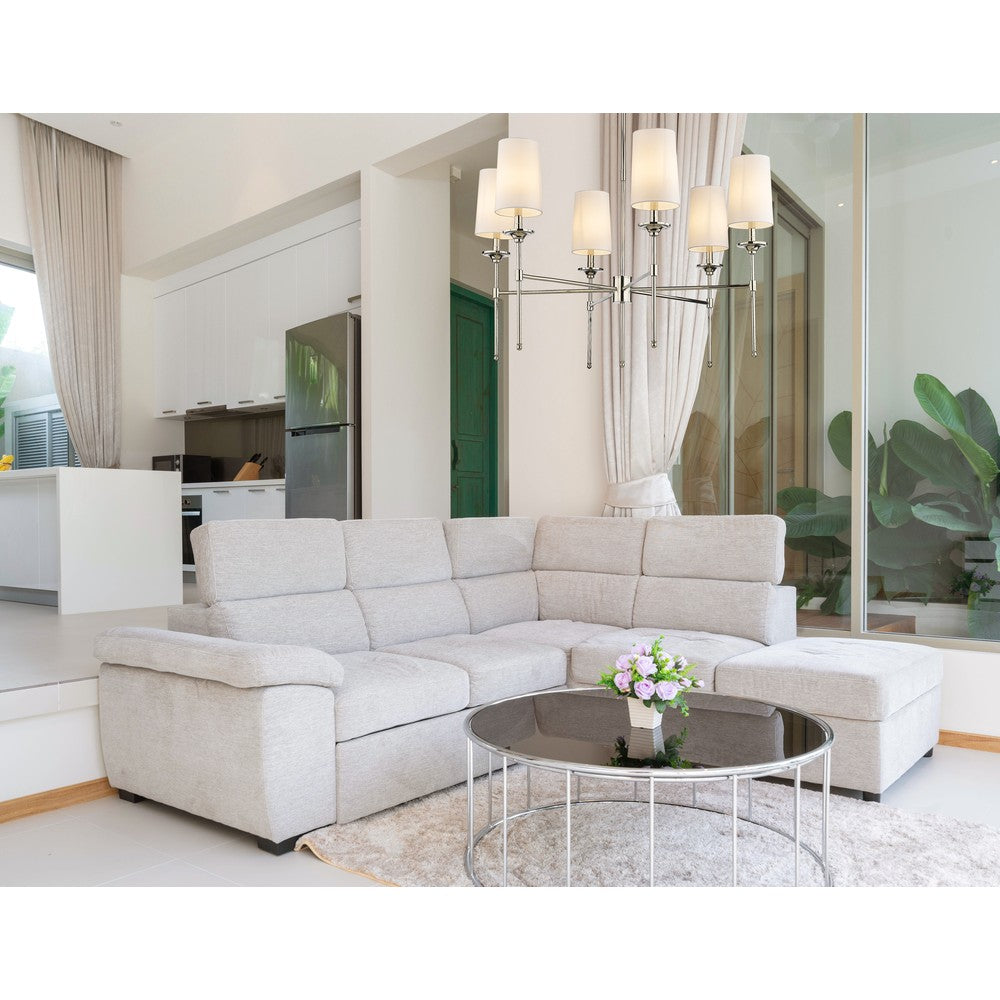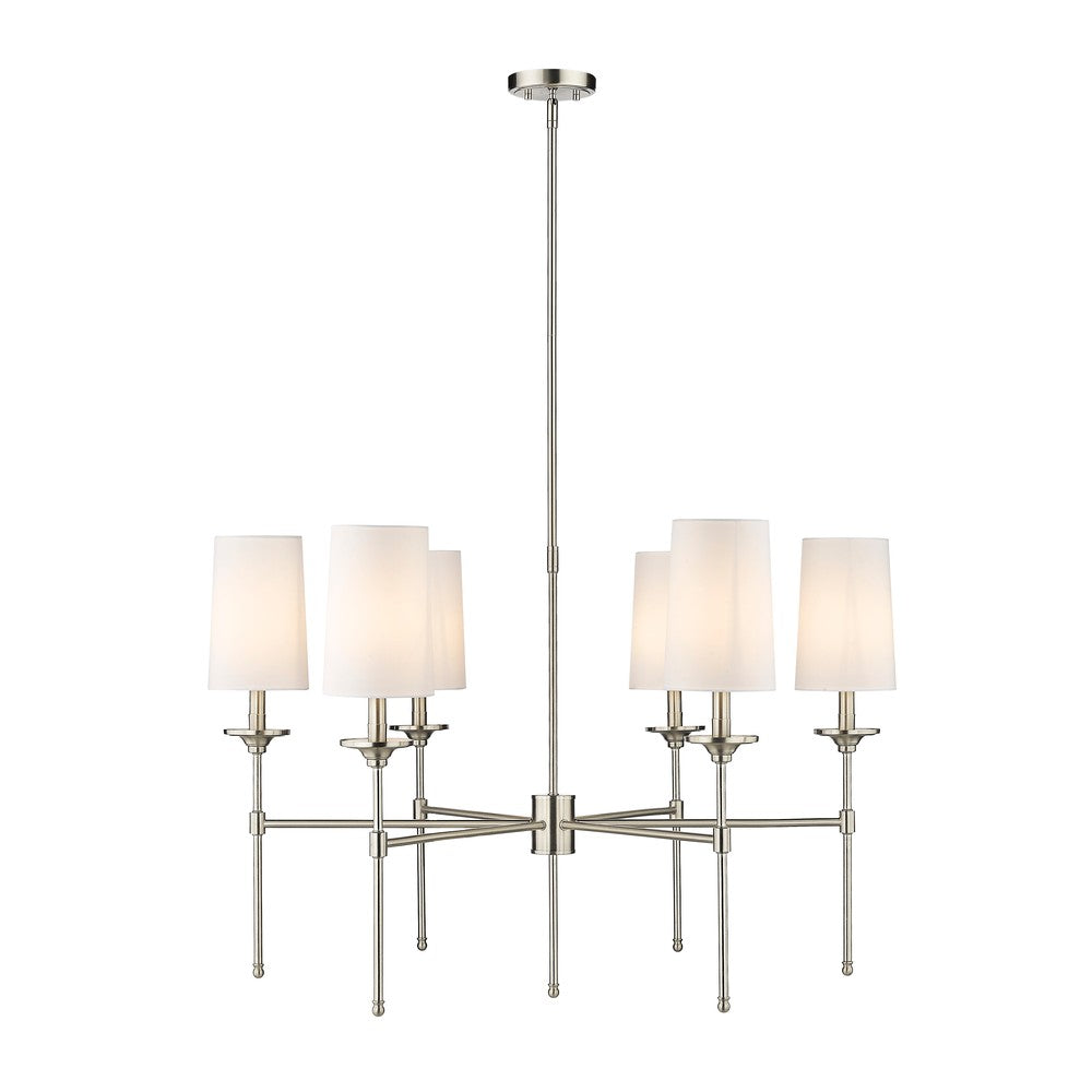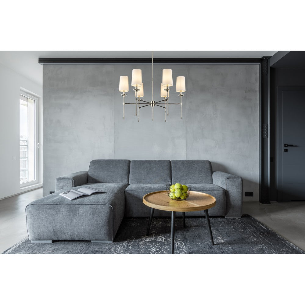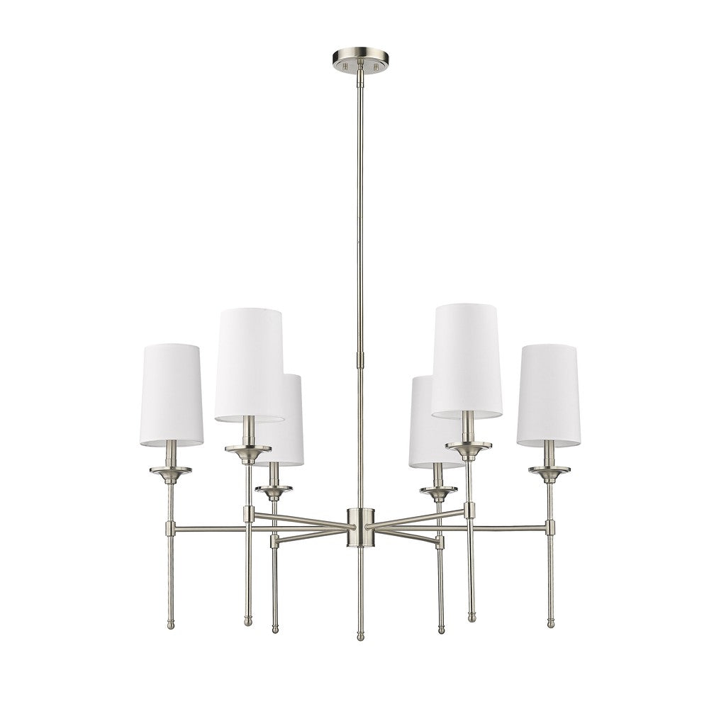 The Emily six-light chandelier presents a theatrical motif perfect for adding indulgent attitude to any transitional or modern space. Stemmed lamp-like lights with soft off-white shades complement a frame crafted of sleek brushed nickel finish metal, forming a sophisticated aesthetic suitable for the most custom dining rooms, living areas, and bedrooms.