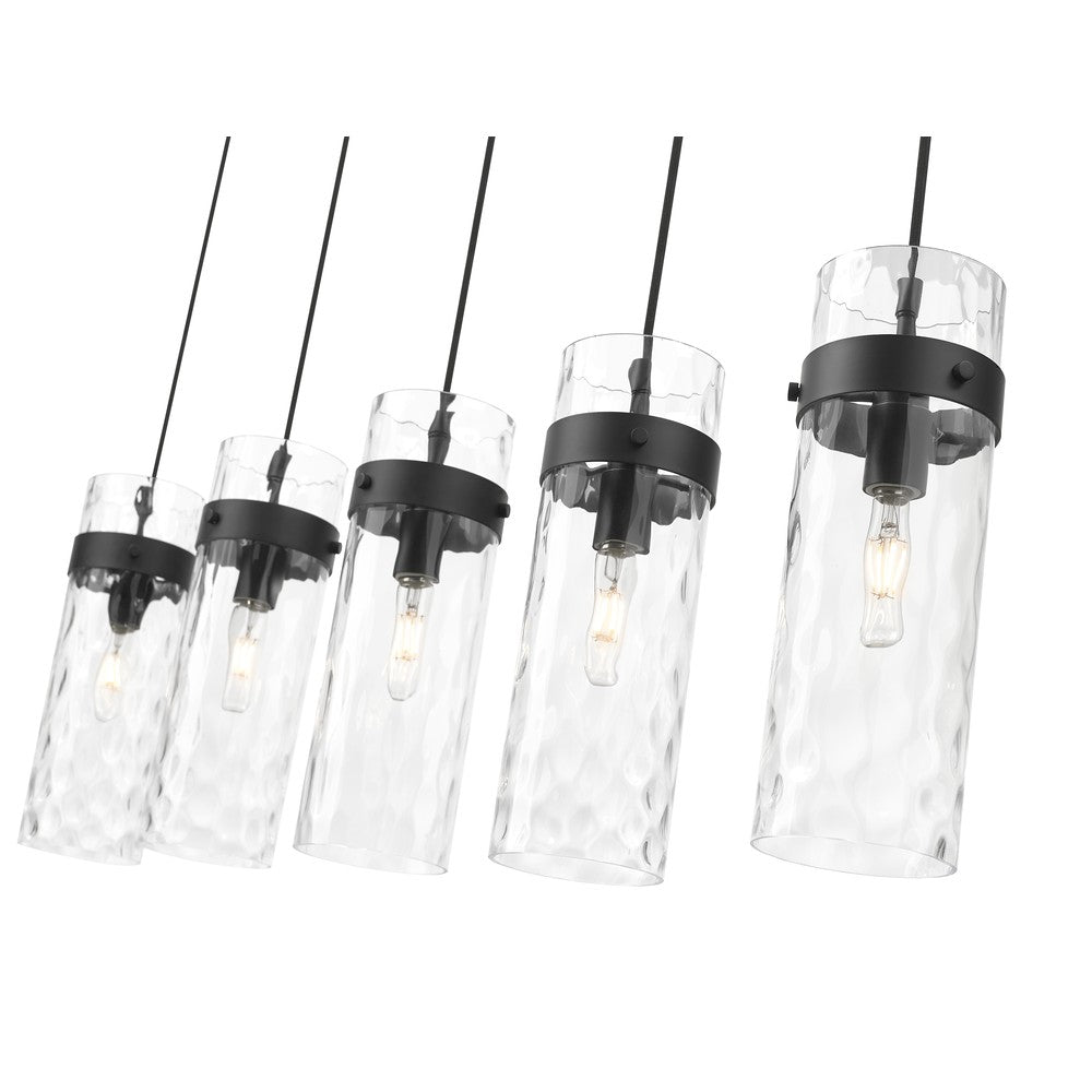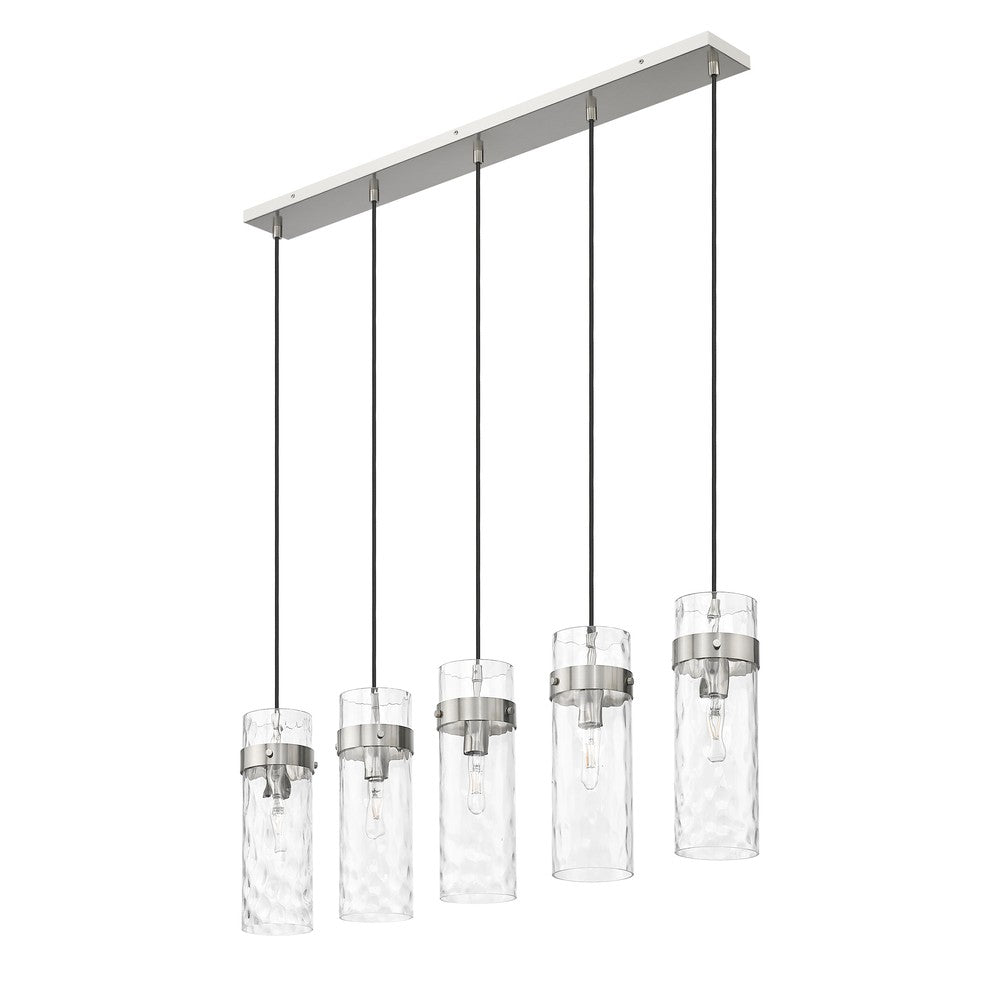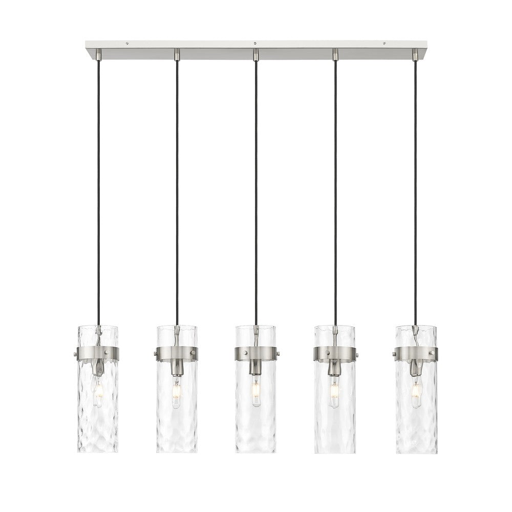 Light a linear space with the simple sophistication of this modern five-light chandelier. Its elongated structure features a brushed nickel finish canopy and metal collars, paired perfectly with braided cord for a thoughtful, opulent look and feel. Shades are gorgeous cylinders of rippling water glass, casting diffused but bright illumination perfect over kitchen islands, entries, and dining tables.