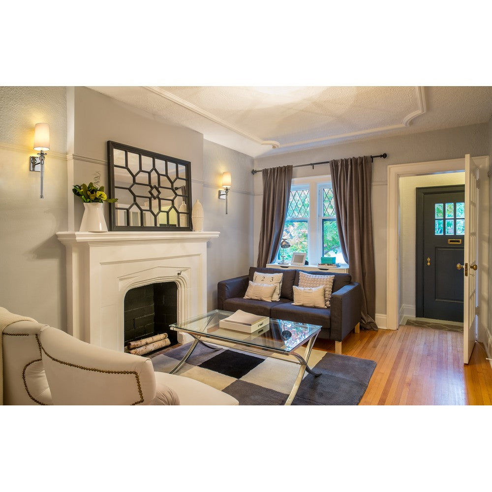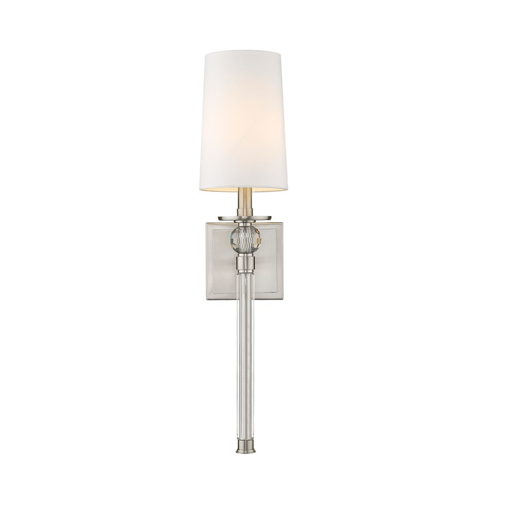 Light up a powder room, bedroom, or hallway with the exquisite artistry of this one-light wall sconce. A traditional lamp motif is modernized with tailored design elements featuring brushed nickel finish steel and crystal. Topped with a fresh white fabric shade, this sconce becomes part of a sophisticated look in a contemporary or transitional space.