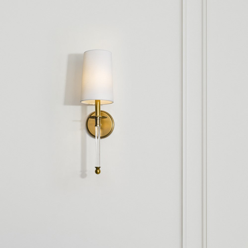 Graceful modern design creates a lift for contemporary bathrooms, bedrooms, and hallways with this elegant one-light wall sconce. Indulge in an artistic linear silhouette blending rubbed brass finish steel with delicate crystal, forming an enticing vertical stem. A fresh white fabric shade seals the classic look of this sconce, a perfect solution for a challenge of extra lighting.