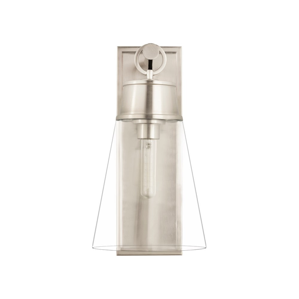 Sophisticated design elements create a classic modern look in the Wentworth wall sconce, a superb choice for updating contemporary spaces with chic sparkle. Its conical shade made of clear glass suspends with a charming loop ring and mounts to a sleek, slender wall plate, all metal elements reflecting a versatile, radiant brushed nickel finish. This wall light borrows a page from romantic nautical aesthetics.
