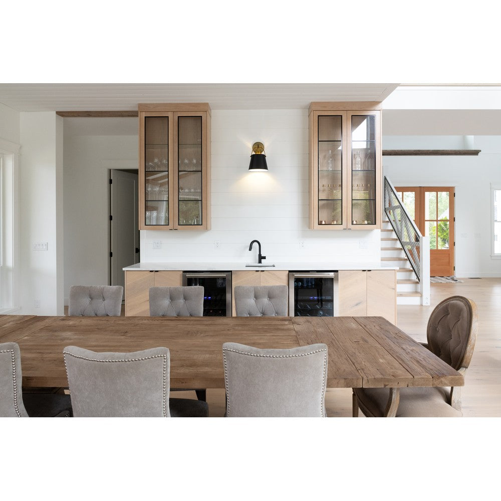Classic industrial style adds a casual influence to this transitional single-light wall sconce, our latest addition to the popular Z- Studio Pendant family. With a tapered matte black or white shade supported by a rich, detailed metal accent in either a Brushed Nickel or Heritage Brass finish, it makes a superb choice for a modern farmhouse kitchen or Industrial space.