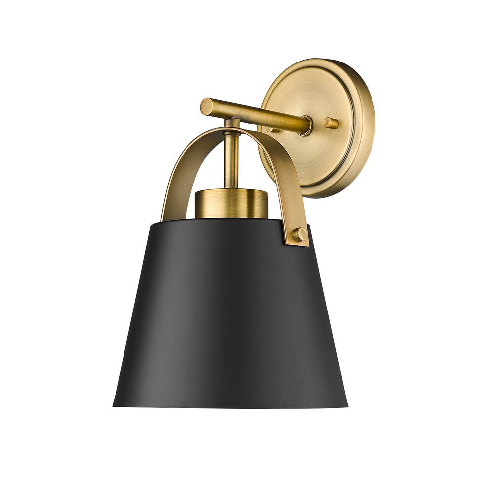 Choose sophistication to bring uplifting elegance in a casual space, adding this single-light wall sconce from the Z-Studio collection. Its tasteful farmhouse industrial design features a conical matte black finish steel shade with heritage brass steel accents. Fresh styling contributes to a striking look as it delivers ambient lighting to hallways, bath spaces, and main living areas.